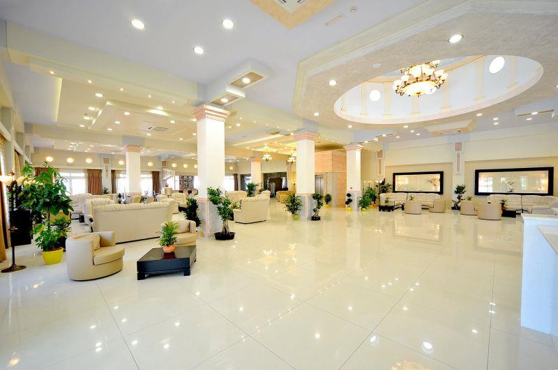 Пройдя центральный вход, перед глазами открывается светлый и очень просторный холл с белыми четырехгранными колоннами, упирающимися в потолок. Все залито ярким светом, а десятки потолочных светильников, как солнечные зайчики, играют на глянцевом полу вестибюля. На фоне всего этого выделяется лишь сочная декоративная зелень и некоторые элементы интерьера, выполненные в темных тонах.