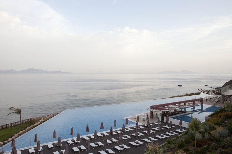 Эффектным трехуровневым амфитеатром расположились на живописных склонах мыса Агиос Фокас современные корпуса нового красавца-отеля Michelangelo. Оригинальные архитектурные решения, авторские интерьеры и ультрамодный декор покоряют с первого взгляда своим «минималистичным шиком». И все же главная визитная карточка отеля – грандиозный, длиной сто шестьдесят метров панорамный бассейн, прозрачная лазурь которого визуально сливается с водами Эгейского моря, продолжаясь до самого горизонта.