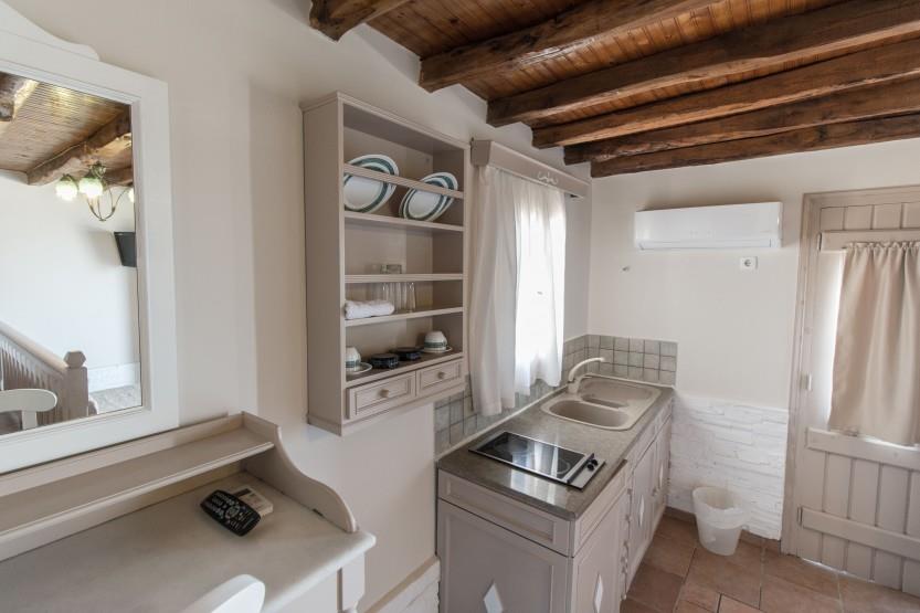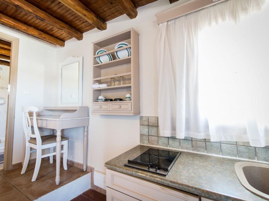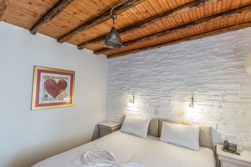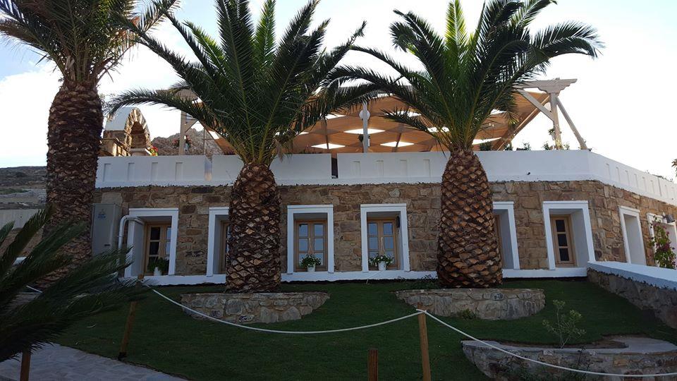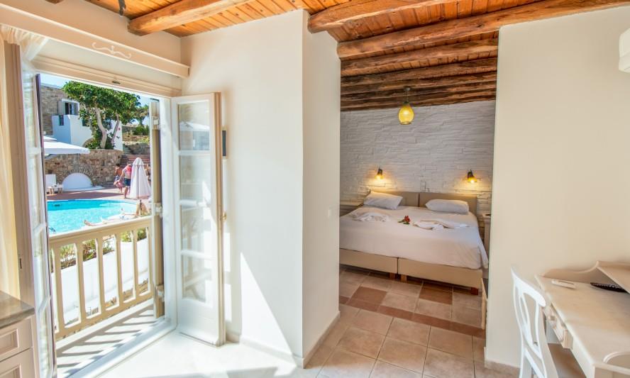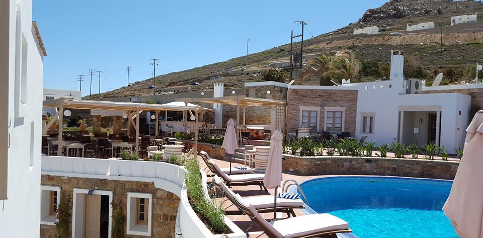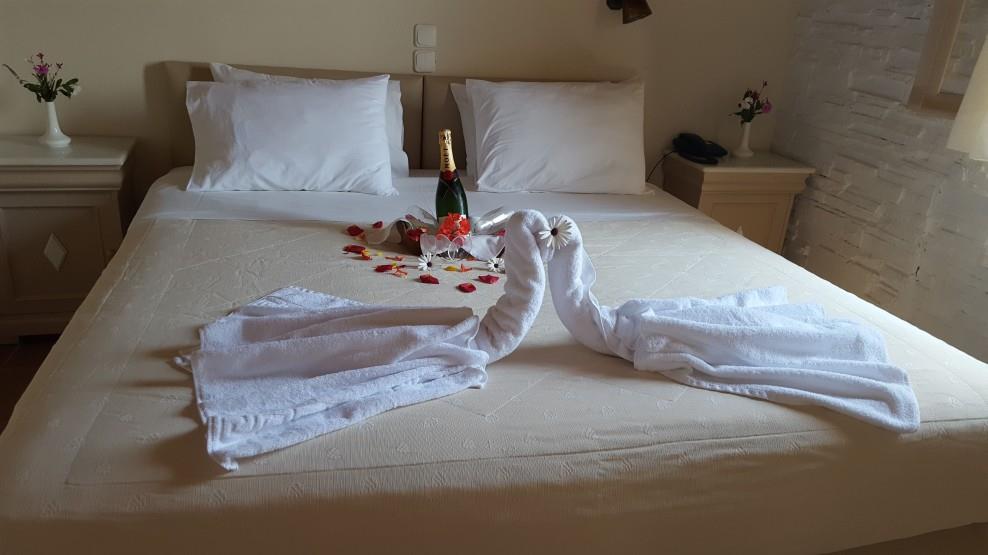 Здание отеля выполнено в традиционном кикладском стиле. А для размещения предлагаются 45 элегантных и просторных номеров, оснащенных сплит-системой, кухней, телевизором, телефоном, террасой, холодильником и ванной комнатой. Отдыхающим могут предоставить детскую кроватку.