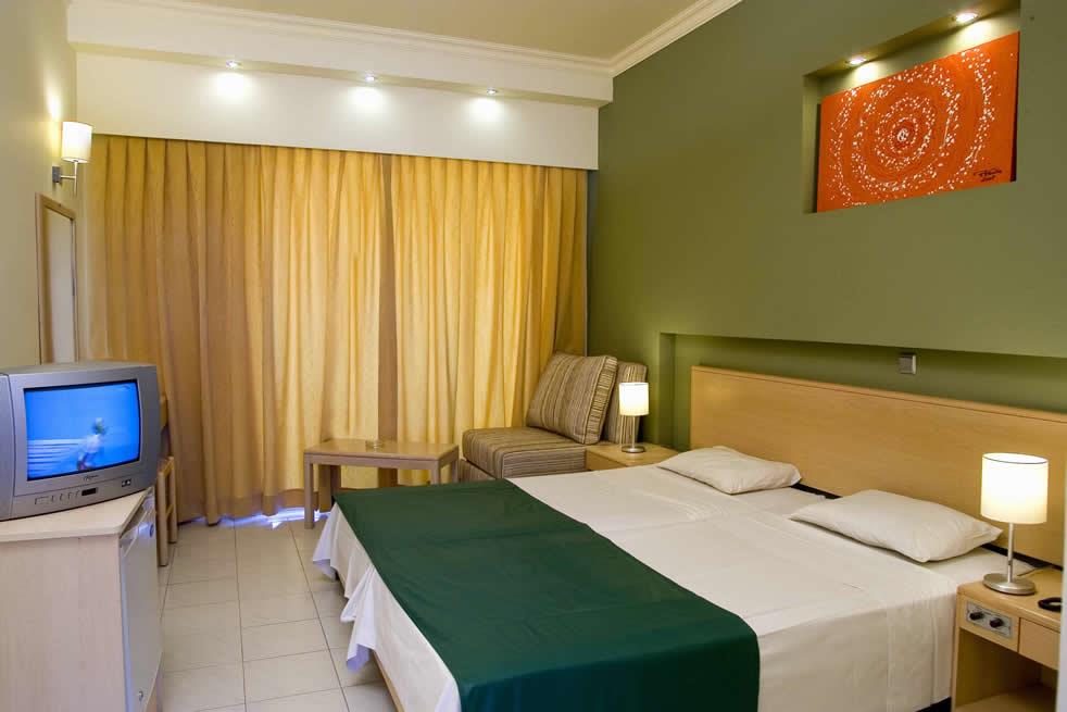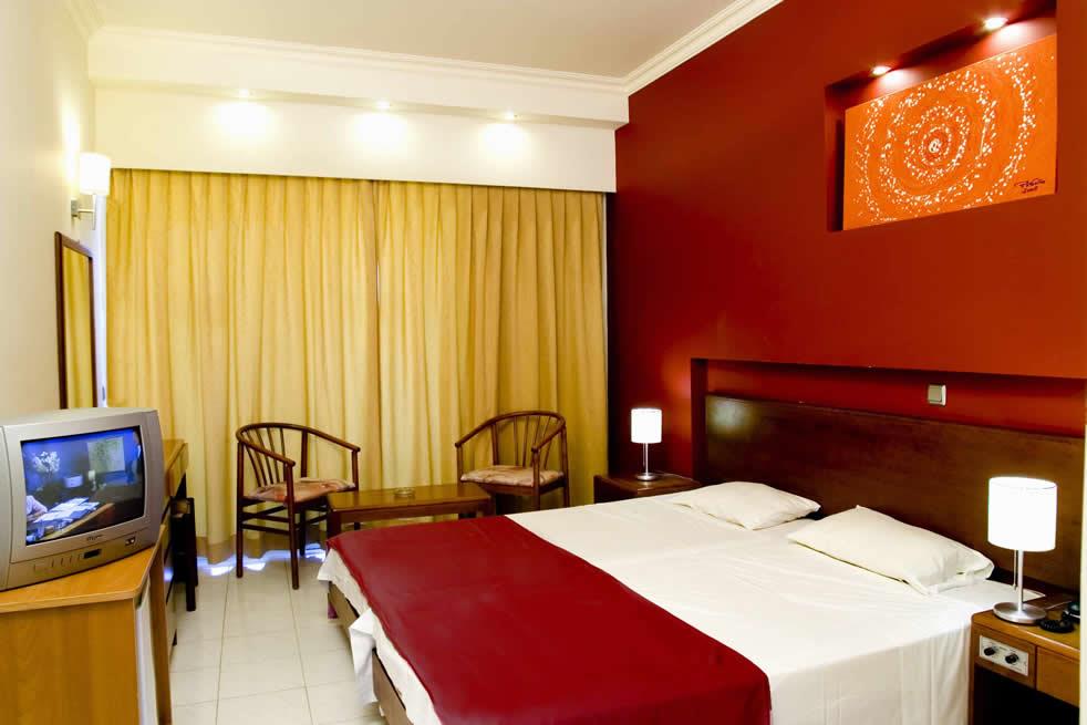 Отель Delfinia Resort располагает ста пятьюдесятью номерами категорий двухместный стандартный или улучшенный семейного типа. Комнаты второго вида рассчитаны на комфортное размещение двух взрослых и двоих детей. Уютные интерьеры со вкусом оформлены в современной стилистике: оригинальные цветовые решения, эффектный декор и строгие, геометрически правильные формы мебели придают апартаментам элегантность и особый шарм. При этом следует все же отметить, что разница в обстановке помещений различных категорий хоть и не разительная, но имеется: так, например, апартаменты семейного типа оснащены LCD-телевизором и DVD-проигрывателем, в отличие от простеньких экранов в обычных двухместных номерах.