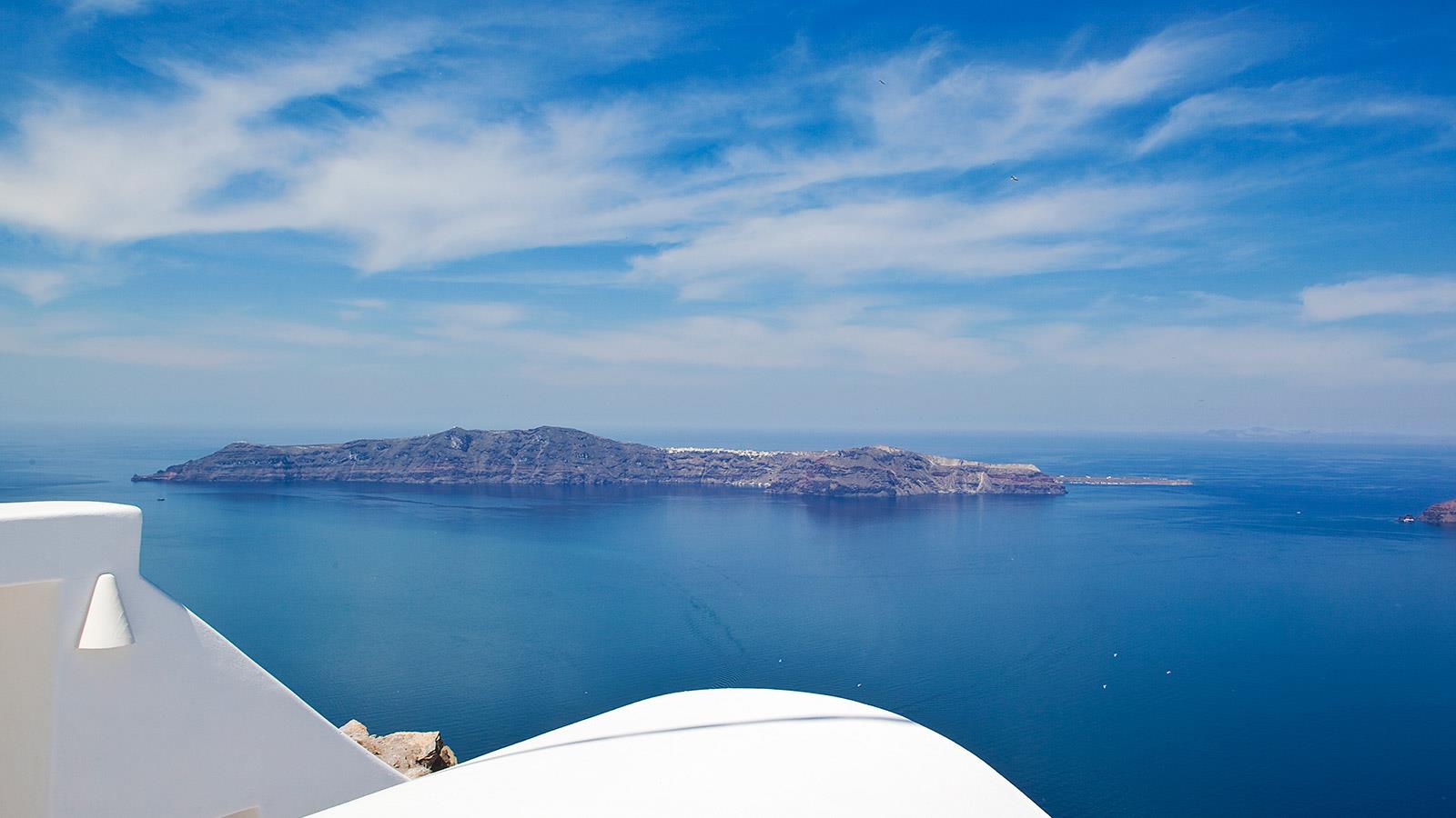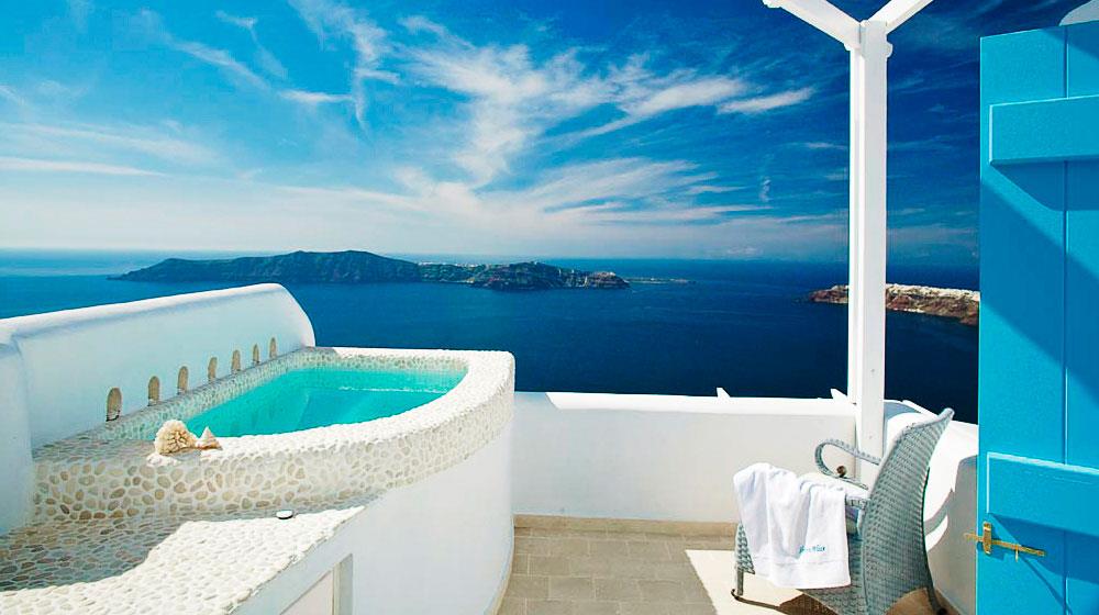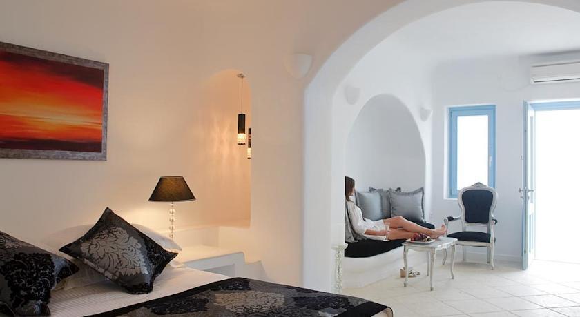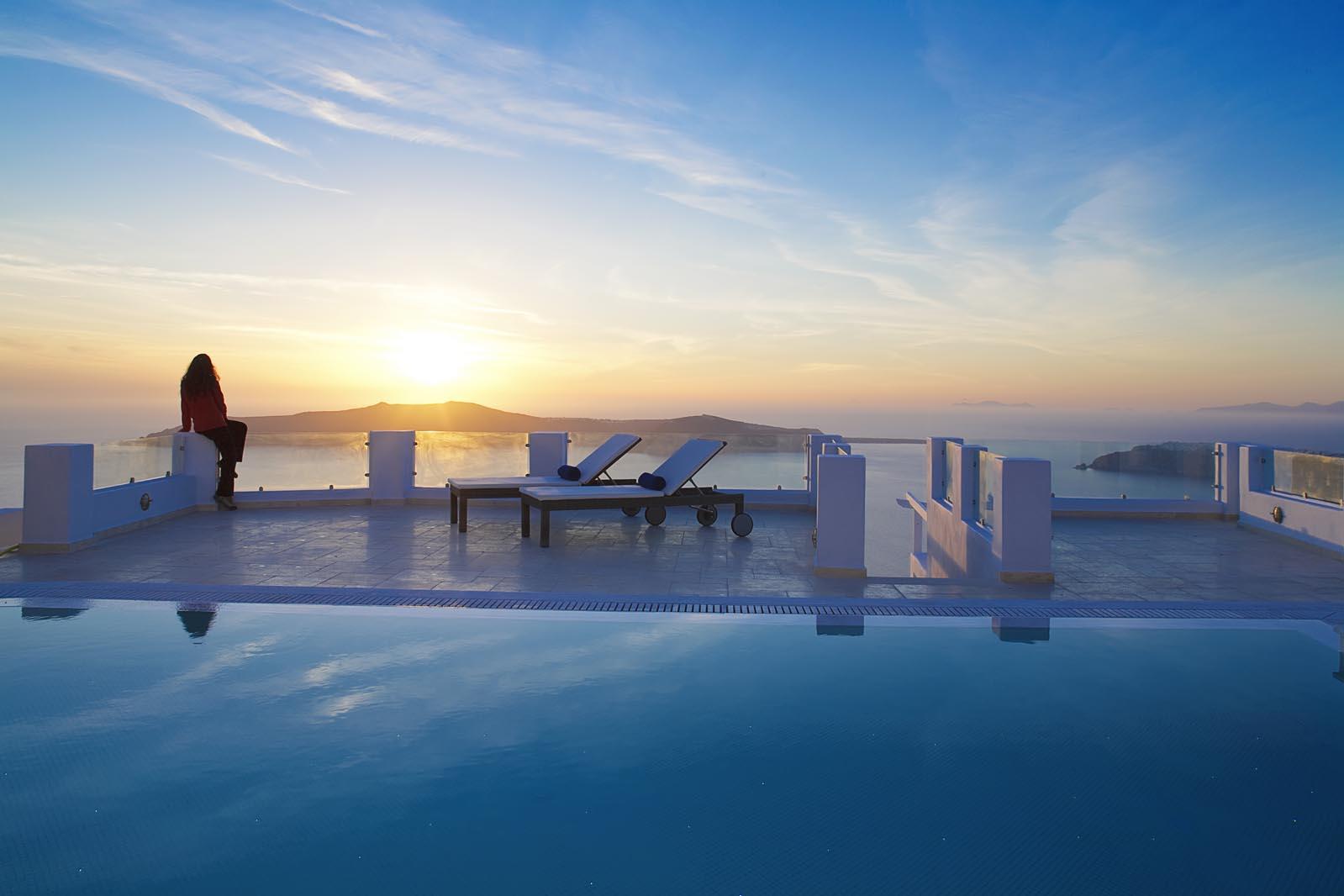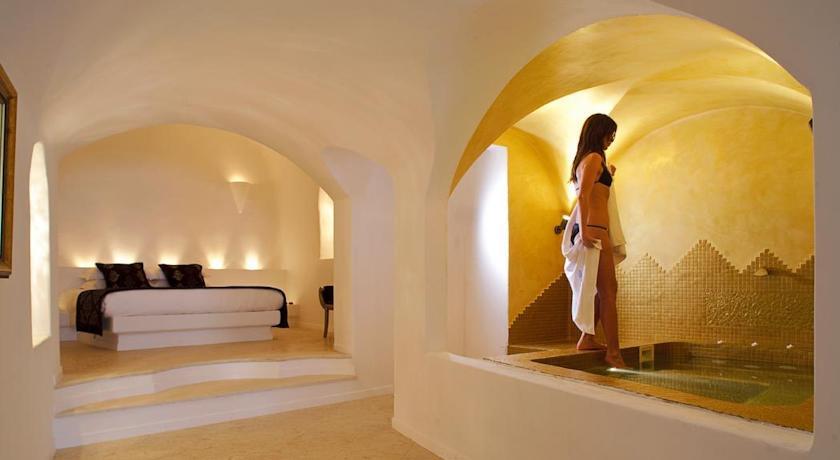 С террас открываются фантастические виды на Эгейское море и кальдеру Санторини. Фантастические – в буквальном смысле, ведь именно на этом острове с живописными скалами, разноцветными вулканическими песками, с особым густым цветом глубоких прибрежных вод и отражающимися в этих зачарованных водах пламенными закатами, и Платон и Жак-Ив Кусто помещали мифическую Атлантиду. Вот эти-то пейзажи и закаты из отеля наблюдать гораздо удобнее, чем с официальной смотровой площадки в поселке Ия. Особенно когда трапезы сопровождаются обязательным шампанским или местным вином.