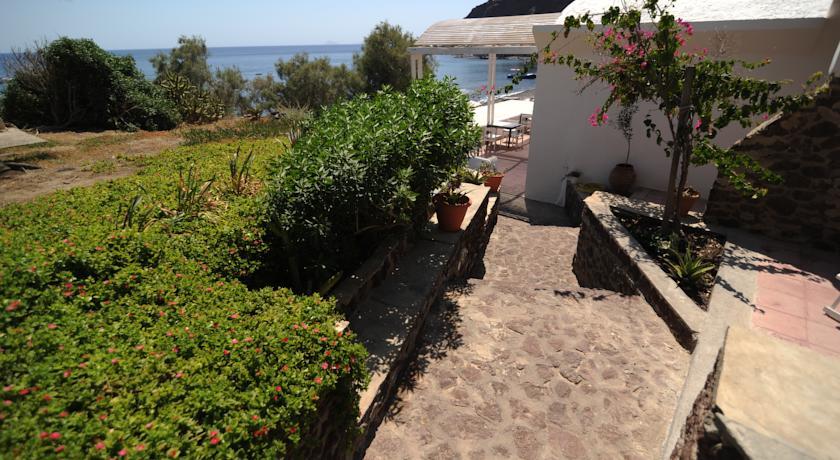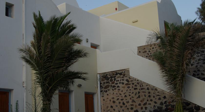 Территория отеля невелика. Значительную часть ее занимают небольшие выложенные плиткой площадки перед выстроившимися в ряд домиками, мимо которых тянется дорожка. Возле каждой такой открытой террасы разбиты клумбы и палисадники, а некоторые коттеджи с каменными навесами буквально утопают в зелени. Дорожка отделяет от жилой зоны густой сад, в тени деревьев которого прячутся небольшие смотровые площадки с шезлонгами на краю утесов. Самое большое пространство с панорамным обзором выделено под солярий. Здесь же стоят столики открытого кафе, над которым на галерее установлены навесы ресторанчика. На всей территории работает бесплатный Wi-Fi.
