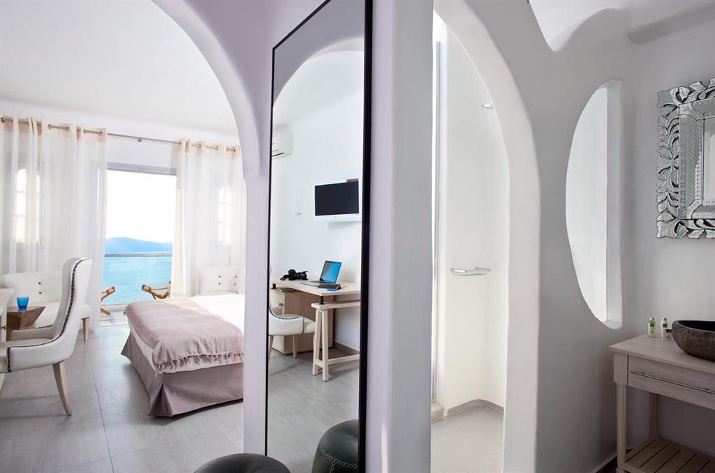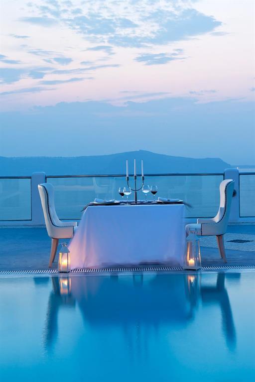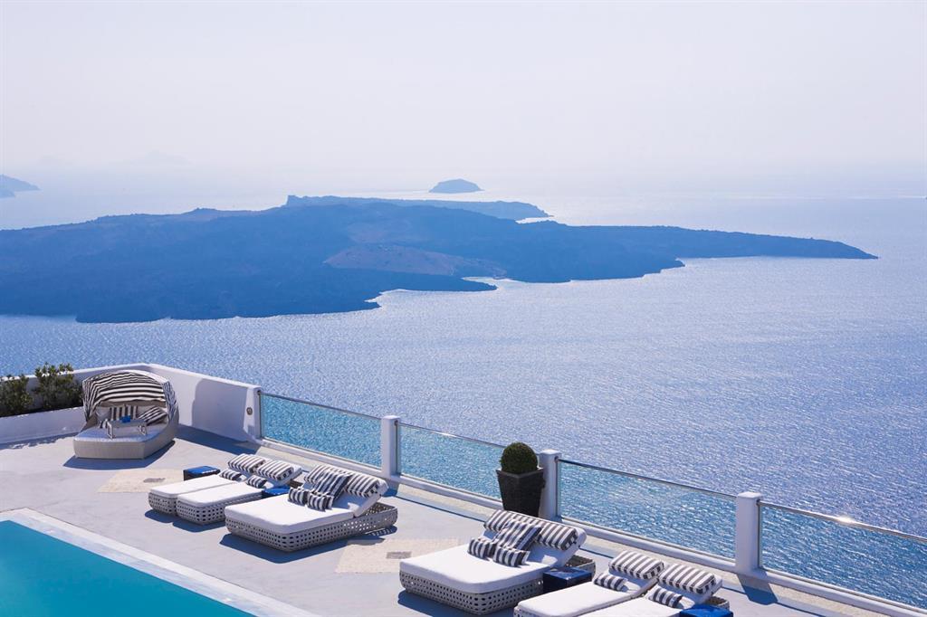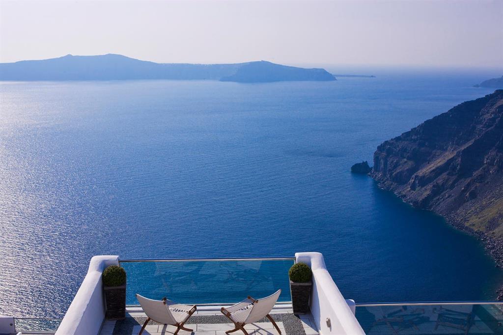 Белоснежное здание отеля Belvedere Suites расположилось на самом краю обрыва на высоте двести семьдесят два метра над уровнем моря. Благодаря этому отсюда открывается захватывающая дух панорама Эгейского моря со снующими по его бирюзовой глади рыбацкими и прогулочными лодочками. Взгляду туристов, остановившихся здесь, предстает и остров Тира с кальдерой вулкана Санторин, активность которого в далекой древности и способствовала образованию одноименного архипелага.