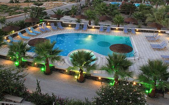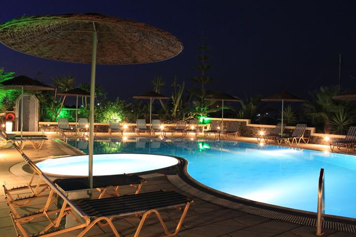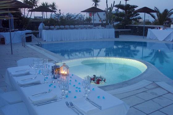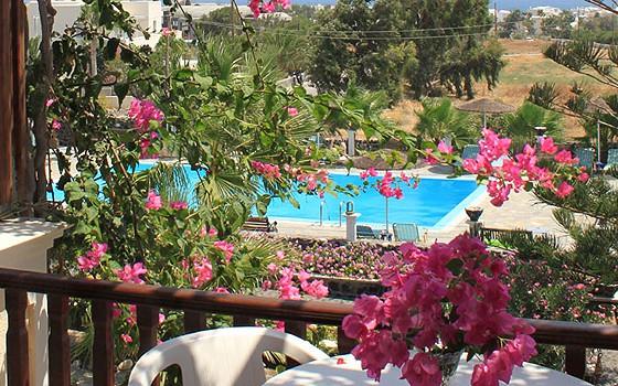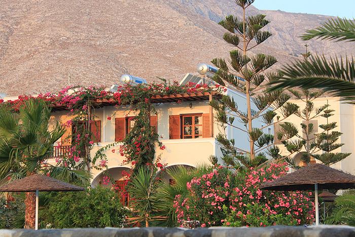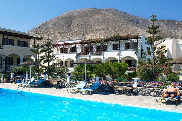 Ярко-бирюзовая вода в бассейне у отеля совсем не похожа на мрачно-синие волны моря на пляже Камари, где вулканические породы в песке на дне придают воде темный цвет. Полосатые лежаки, накрытые тенью соломенных зонтиков у бассейна, окружены толстыми стволами пальм, огромными кактусами, высокими соснами и разноцветными пятнами клумб. Вся эта красота на фоне морского пейзажа составляет живописную картину за окнами одних номеров, а в других комнатах окна смотрят на покатые склоны гор с хорошо просматривающейся «змейкой» дороги, которая ведет к развалинам античной Фиры.
