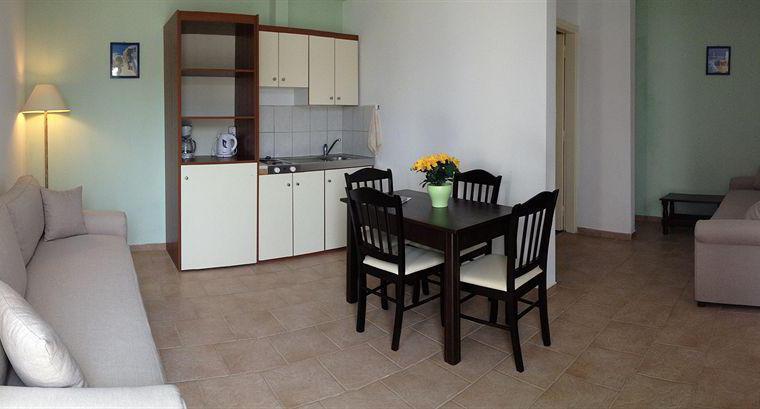 Scorpios Beach Hotel предлагает комфортное размещение в одном из двадцати трех просторных номеров, среди которых имеются четырнадцать студий, восемь – семейных апартаментов и один maisonnette . Это просторные и функциональные помещения с приятным интерьером в стиле модерн и небольшой кухней. Резная деревянная мебель – комод, двуспальная кровать, прикроватная тумбочка, керамическое покрытие пола и светлые стены делают интерьер комнат простым и одновременно, по-домашнему теплым. Студии оснащены кондиционером, холодильником, сейфом, телевизором и кофеваркой, а апартаменты, состоящие из гостиной и спальни, располагают собственным кухонным уголком и обеденной зоной. В каждой комнате есть отдельный санузел с ванной или душевой кабиной, а так же балкон или терраса с прекрасным видом на море или на внутренний двор и постройки комплекса.