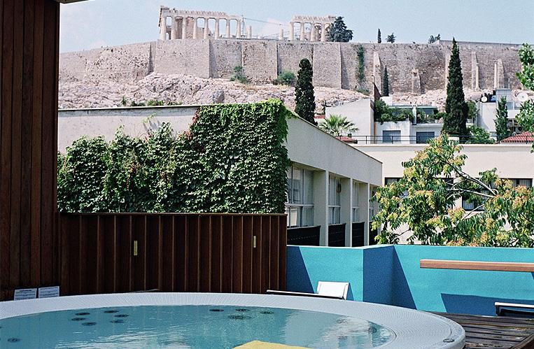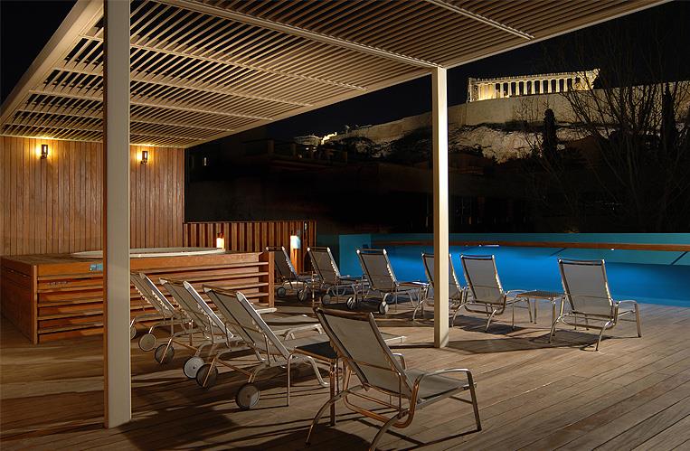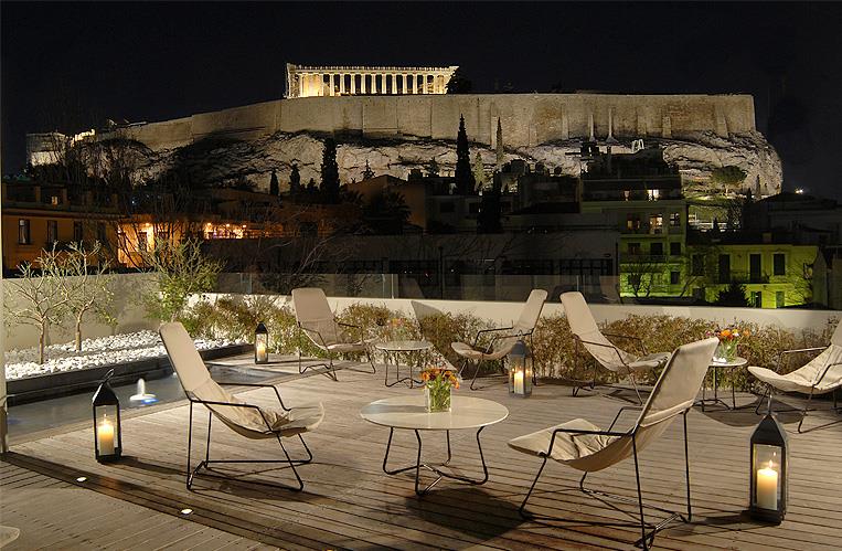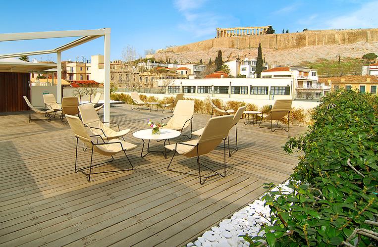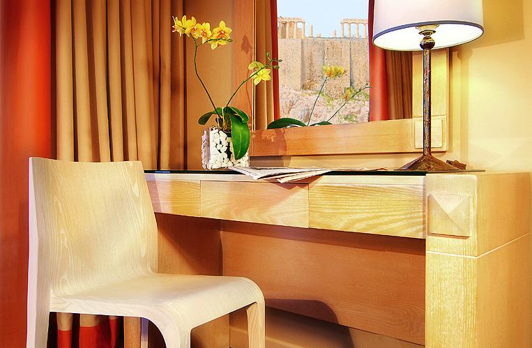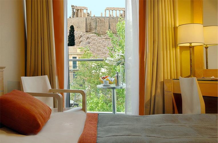 – прекрасное место для душевных бесед, украшенное деревянными потолками, греческими произведениями искусства, антиквариатом и камином, а также кофейня во внутреннем дворике со стеклянной крышей, через круглые отверстия которой поднимаются вверх толстые стволы средиземноморских деревьев. Но самая романтичная атмосфера царит на крыше гостиницы: с террасы, украшенной небольшим садом, виден весь Акрополь, увенчанный Парфеноном, который по ночам красиво подсвечен желтым цветом. Не меньший восторг вызывает городской пейзаж бесконечного города, раскрашенного яркими огнями. Вид на главный храм древних Афин открывается и из окон многих номеров Herodion, приглашая гостей полюбоваться им за завтраком на отдельном балконе. Комнаты обставлены стильной мебелью и украшены вазами с цветами, но еще больше гостей восхищают ванные комнаты с мраморным покрытием на стенах, ванной, душевой кабиной, полным набором туалетных принадлежностей и феном. Техническое оснащение апартаментов дополнено телевизором со спутниковыми каналами, кондиционером и телефоном. В отеле постояльцам предоставляются услуги химчистки, проката автомобиля. Также на территории работает сувенирный магазин и пункт обмена валюты.