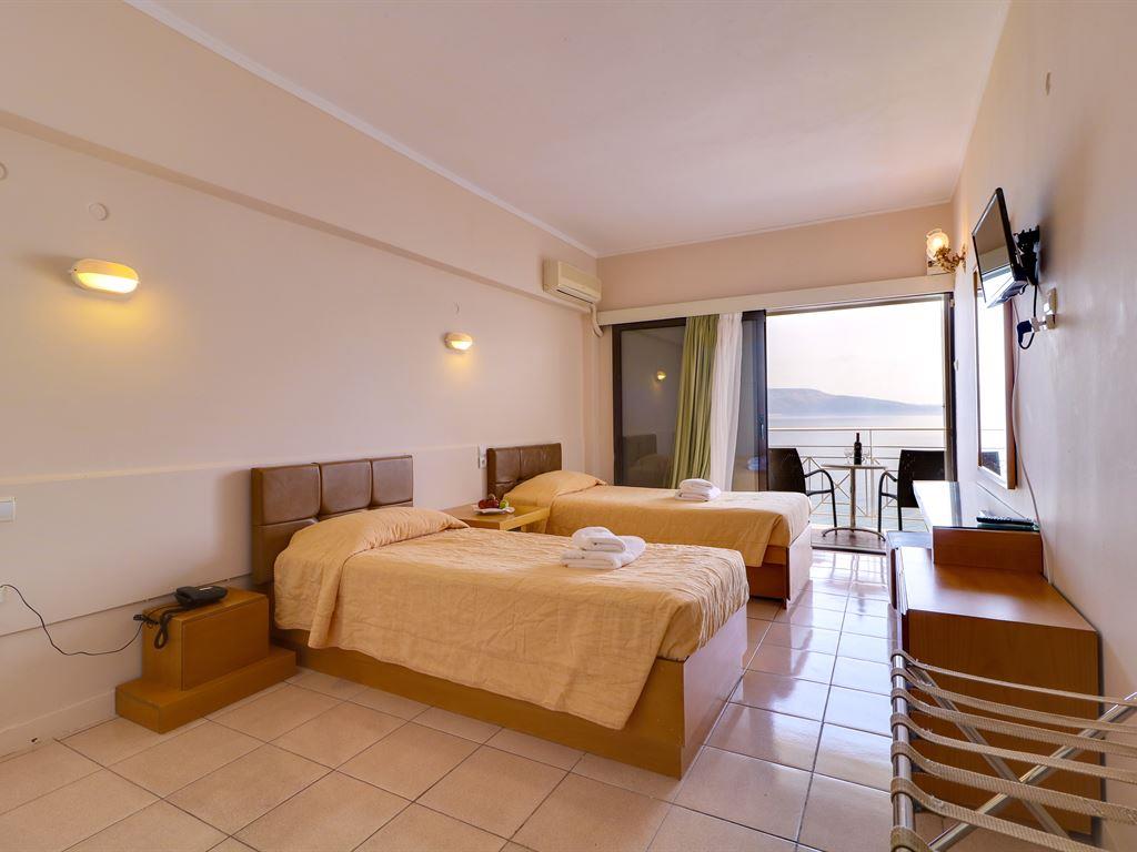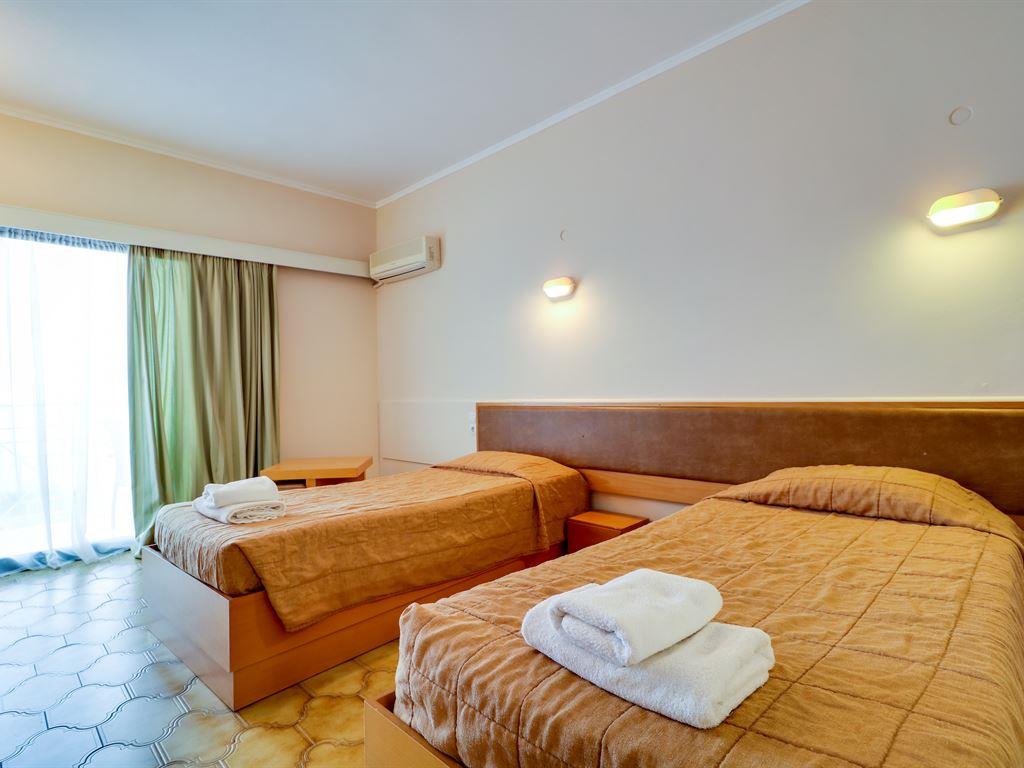 Независимо от номера – а их в отеле насчитывается 185 – гости имеют в своем распоряжении прямой телефон, кондиционер, телевизор, холодильник, балкон. Фен выдается на ресепшен по запросу. Окна выходят либо на морское побережье, либо на горы.