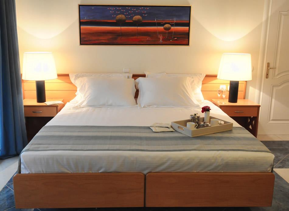 В отеле семьдесят восемь сьютов. В зависимости от количества человек, заселение происходит в однокомнатные номера или же апартаменты с одной или двумя спальнями. В супериор и гранд- сьютах установлены королевские просторные кровати с балдахинами, выделена обеденная зона, имеются наборы для приготовления чая и кофе, мини-кухни. Ванные комнаты с джакузи отделаны мрамором. С балконов открывается панорамный вид на Ионическое море. Номера выдержаны в стиле минимализма, в расцветках преобладают ласкающие глаз пастельные тона. Комнаты оснащены всем необходимым для комфортного отдыха: кондиционерами, телевизорами, доступом в Интернет.
