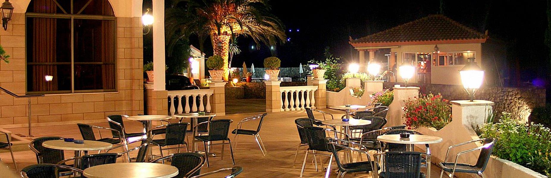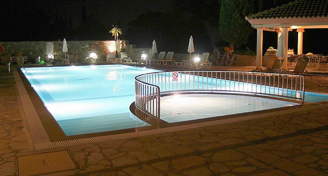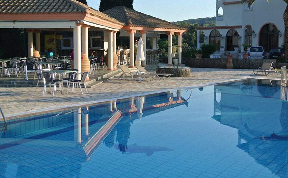 На склоне одного из холмов, густо поросшего оливковыми и кипарисовыми рощами, разместилась небольшая территория гостиницы. Извилистые аллеи с чередой подстриженных кустарников и цветущих клумб по обочинам влекут туристов в центральную часть, где расположены корпуса сложной конструкции, декорированные колоннами и арками. Рослые пальмы отбрасывают замысловатые тени на неподвижную гладь бассейна, террасы вокруг которого обставлены шезлонгами. В трехстах метрах находится пляж Ипсос, оборудованный лежаками и навесами. Здесь любители активного отдыха играют в волейбол, водное поло и занимаются дайвингом. Путешественники предпочитают велосипеды или верховую езду, чтобы изучить живописные окрестности. В пору дневного зноя посетители приходят в комнату отдыха, где имеются бильярдный стол и мягкие диваны.