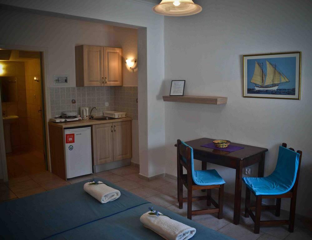 Отдыхающие могут разместиться в студиях (2-3 человека) и в апартаментах (4-5 человек). В номерах установлена сплит-система, сейф. На небольшой кухне есть холодильник, чайник, плита, а также необходимые столовые приборы. Утюг и фен предоставляются по запросу. Также при необходимости в номер может быть доставлена детская кроватка.