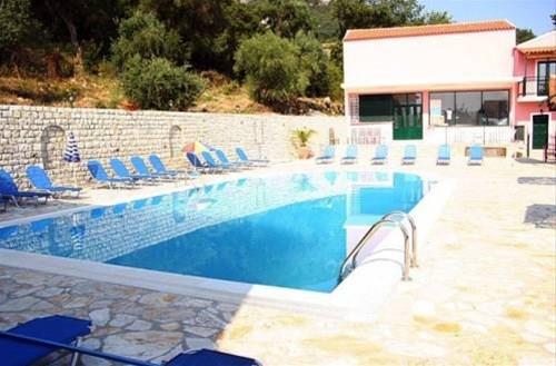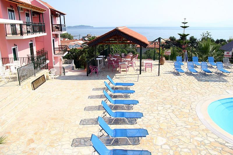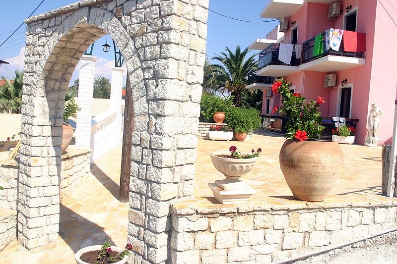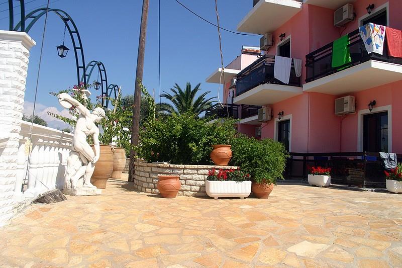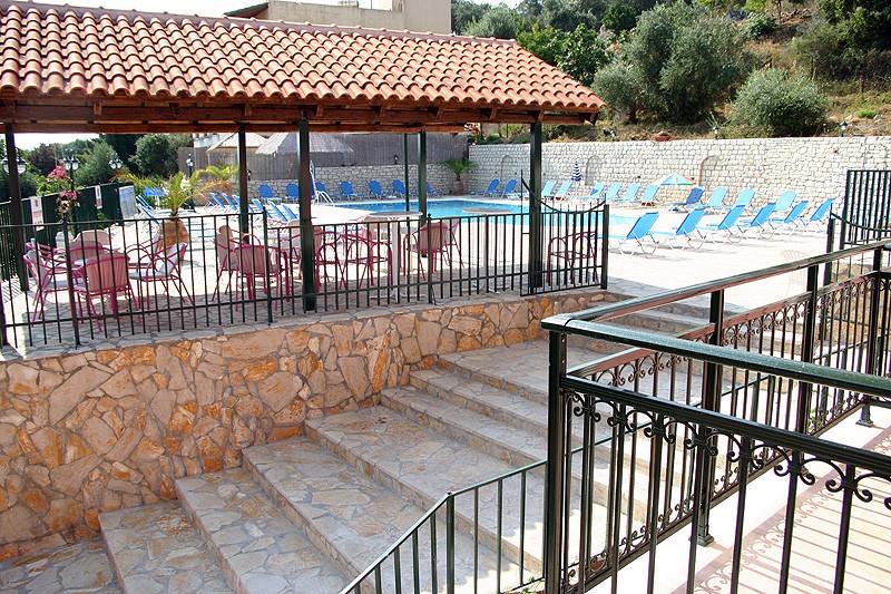 Прилегающая к отелю территория небольшая, но интересно оформлена. Центральный ее элемент – бассейн с пресной водой, вокруг которого расставлены лежаки и зонтики. Вся остальная площадь вымощена известняком, из него же сооружены входная арка и небольшая клумба, на которой произрастают розовые кусты, источающие нежный аромат. Камень днем нагревается, а вечерами отдает свое тепло: по нему приятно ходить босыми ногами, впитывая в себя силу греческого солнца.