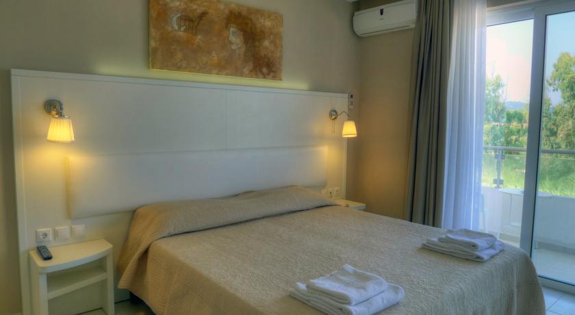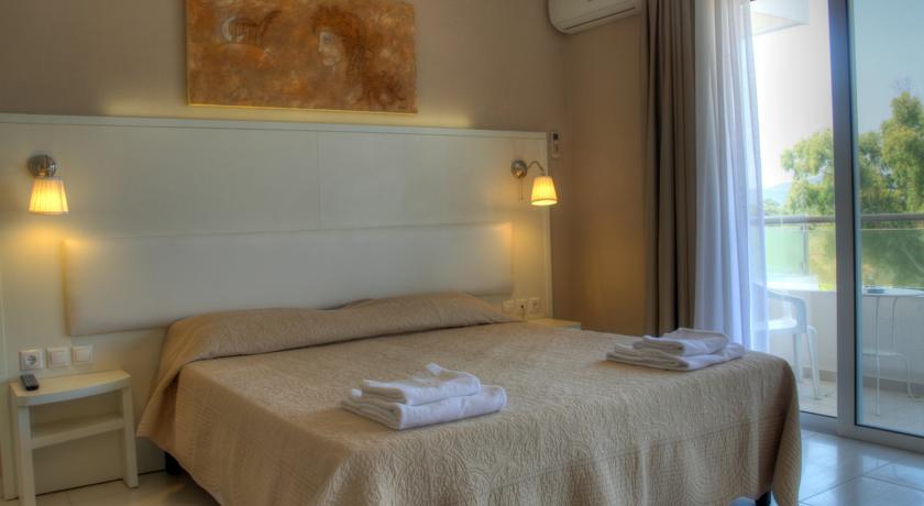 Sidari Beach Hotel расположился в северо-западнрй части Корфу, в городке Сидари, и смотрит из-под прикрытия живописных холмов на очаровательный канал Любви, морскую мелководную лагуну, которая вторглась в сушу узкой полосой более чем на двести метров. Отель был приобретен итальянской семьей Кампанелли, среди членов которой есть и дизайнеры интерьеров, после чего его заново отделали в итальянском стиле, и комплекс сильно преобразился. Тридцать пять номеров Sidari Beach Hotel предлагают гостям сочетание элегантности, естественности и вполне современной функциональности. Все номера оснащены кондиционерами, телефонами, спутниковым телевидением и беспроводным Интернетом, помещения защищены противомоскитными сетками, оборудованы мини-барами. Встроенная мебель оставляет в них много простора, а средиземноморские мотивы лаконично вплетены в натуральную цветовую гамму отделки и декора, где доминируют разнообразные оттенки зеленого и коричневого: оливковый, древесный, песчаный и другие. Балконы имеются во всех комнатах без исключения, вид на море также открывается из большей их части, за исключением двухместных помещений эконом-класса на цокольном этаже. Помимо двухместных, гостиница располагает покоями для трех и четырех человек. Гости Sidari Beach Hotel любуются первозданными пейзажами изумрудного Корфу из шезлонгов, что на площадке у бассейна, или располагаются рядом на большой террасе-солярии для принятия солнечных ванн. Водоема на территории два, один из них выделен детям. Ресторан с видом на море предлагает не только местные блюда, но и лучшее из итальянской кухни, а также изысканные итальянские вина и десерты, приготовленные поварами-экспертами – подлинными мастерами своего дела. Пляж отеля – один из лучших на побережье, вода в море здесь мелкая и купаются здесь и дети, и неопытные пловцы. Еще две широкие песчаные полосы протянулись вдоль всего города, здесь много красивых бухт, которые защищены от ветров скалами. Сидари, удобно связанный с Корфу, Родой и другими городами острова автобусными рейсами, славится оживленной ночной жизнью, и поэтому привлекает к себе много молодежи. Однако день здесь немногим уступает ночи: множество магазинов, сувенирных и продуктовых лавочек, ресторанов и кафе радушно встречают гостей, работают пункты проката наземного транспорта и водного снаряжения, экскурсионные бюро, что предлагают, среди прочего, туры на острова, расположенные у берегов Корфу, такие как Диапонтиа Пакси и группы островов, в районе соседней Албании. Верховая езда или дайвинг также популярны среди отдыхающ
