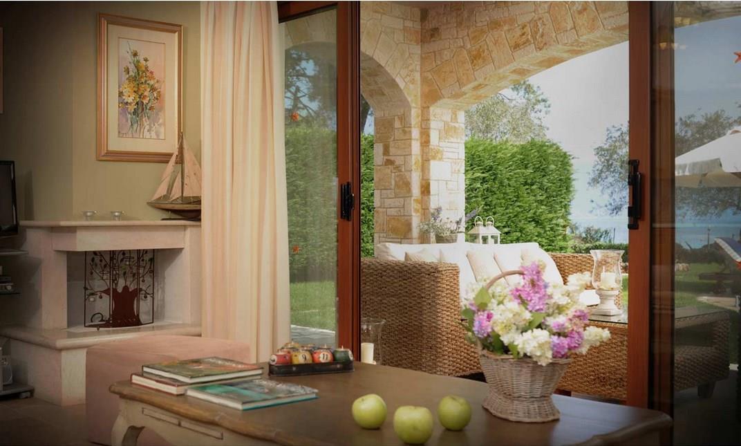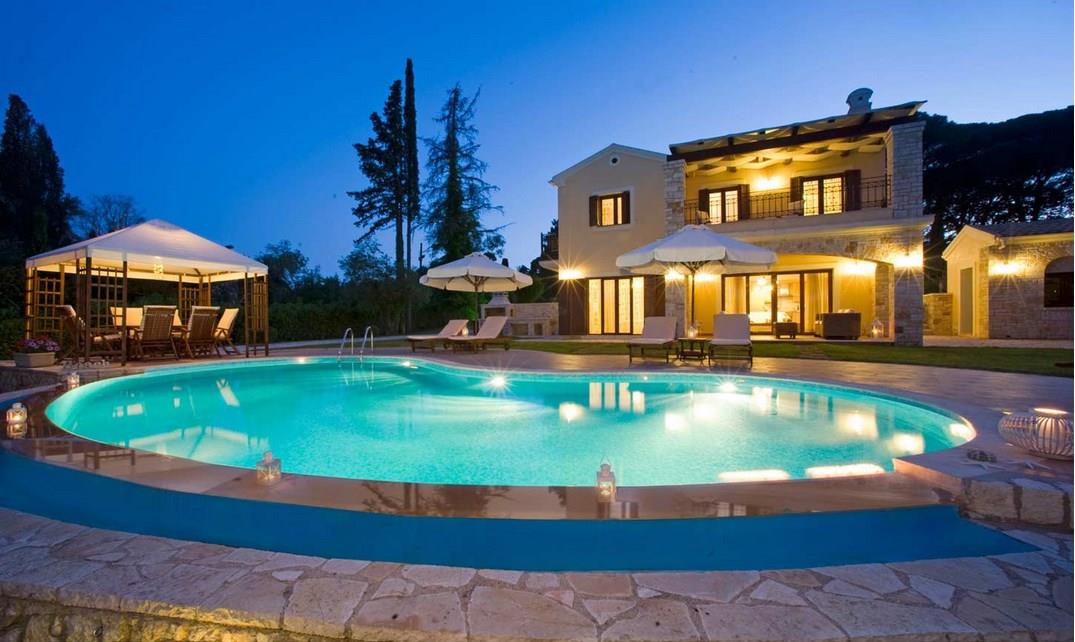 Вход обрамлен небольшими приветливыми колоннами, ему предшествует крытая терраса, на которой разместились несколько диванов и плетеные кресла. Есть здесь и бассейн с шезлонгами и зонтиками. С одной стороны к нему примыкает стена с небольшим фонтаном, украшенная дизайнерской композицией в серых и светло-коричневых тонах. По вечерам вся эта водная композиция освещается фонарями, что создает романтическую обстановку. Рядом с бассейном находится беседка под балдахином, где расположился диван с подушками. Сам бассейн элегантно оформлен старинными амфорами, они живописно разбросаны и в саду.