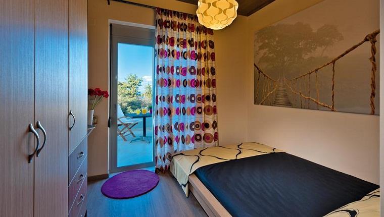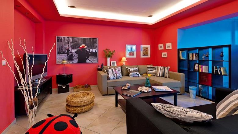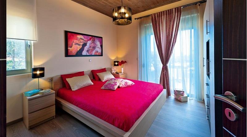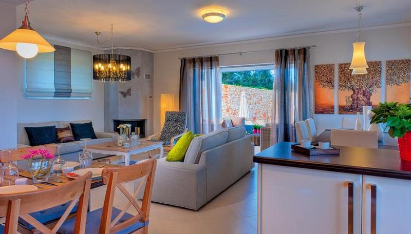 Кухня цокольного этажа соединена широким открытым дверным проёмом с просторной гостиной, своего рода студией. Гостиная чисто условно разделена невысоким декоративным барьером на две части: в одной стоит обеденный стол со стульями, в другой расположились мягкие диваны, кресла, интернет-уголок, библиотека с книгами и журналами, место для детских игр. Здесь же, на цокольном этаже оборудованы ванная комната с джакузи и мини-спортивный зал. Стеклянные двери гостиной выводят в нижний ярус территории виллы, откуда полого спускается вниз, в городок Герани, вымощенная дорожка. Вторая кухня так же объединена с гостиной, в которой, кроме мягкой мебели, стоит самый настоящий камин. Широкие двери гостиной ведут на просторную веранду со столом в окружении мягких диванов и кресел. На втором этаже виллы – три спальни, в каждой из которых – ванная комната и меблированный балкон.