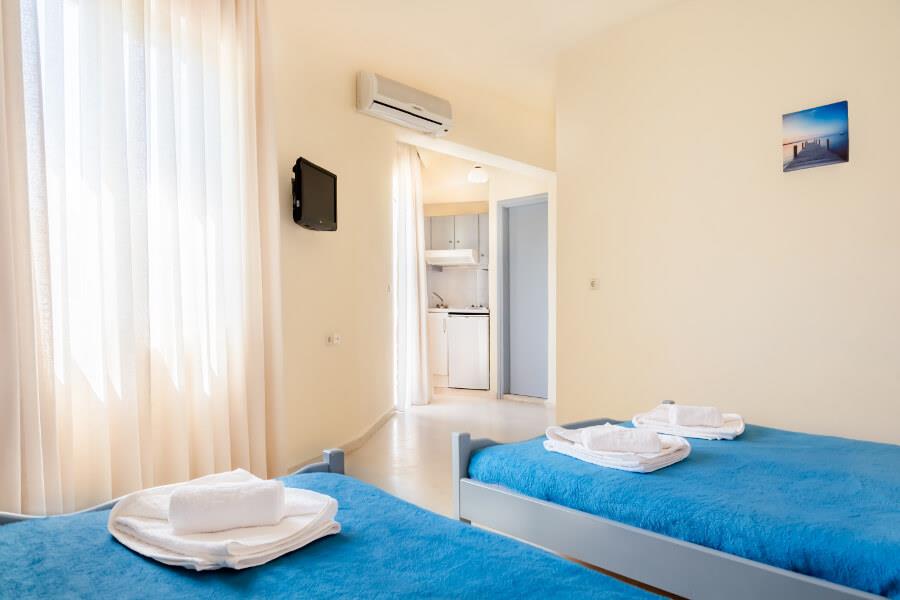 Номерной фонд представлен 24 студиями и двухкомнатными апартаментами. Все они оснащены сплит-системой, сейфом, телевизором, террасой, холодильником, а также собственной ванной комнатой. В некоторых номерах обустроена небольшая кухня с необходимыми принадлежностями. Кроме этого, у постояльцев есть доступ к интернету, а значит, они всегда будут на связи.