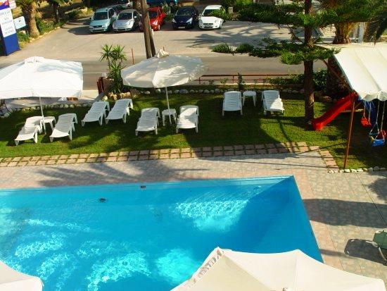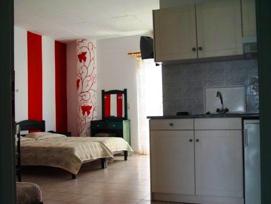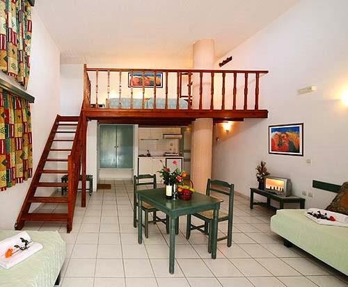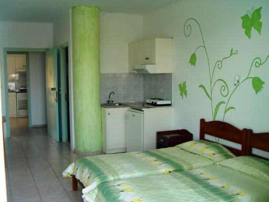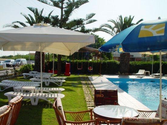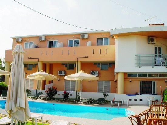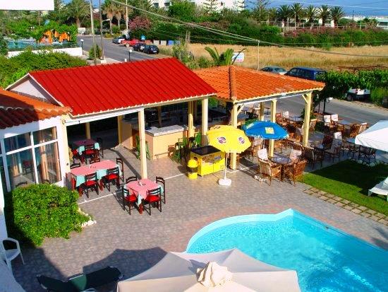 Каждый номер обставлен удобной функциональной мебелью и располагает небольшой мини-кухней с холодильником, раковиной, электроплитой и комплектом необходимой посуды. Предусмотрены кондиционер с индивидуальным контролем и телевизор. В некоторых уборных имеются ванны, другие же оборудованы душем. А с балконов открывается замечательный вид на Критское море и зеленую ухоженную территорию отеля, где разлился в окружении столиков и шезлонгов бассейн с прозрачной водой. По соседству с водоемом открыт небольшой уютный бар, в котором отдыхающим доступны горячие и прохладительные напитки, а также легкие закуски и гамбургеры.