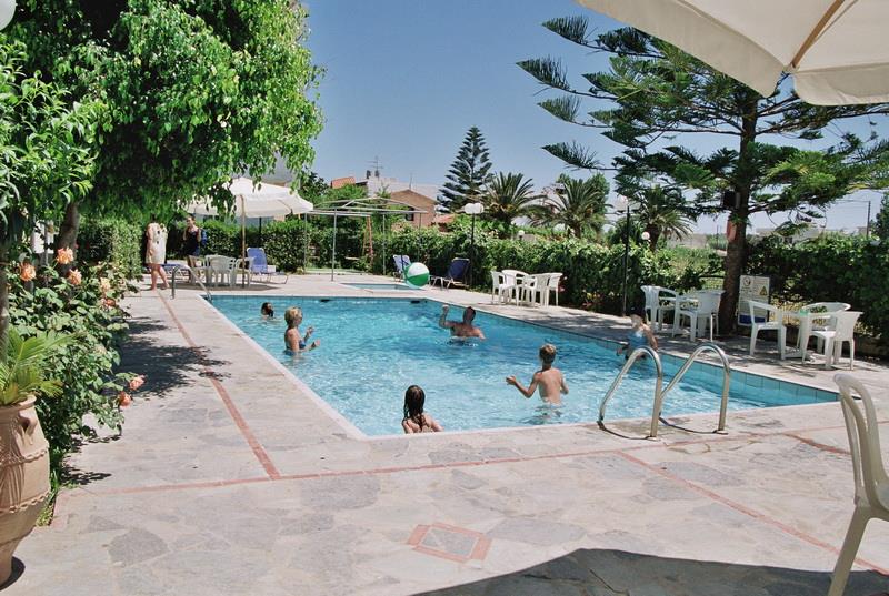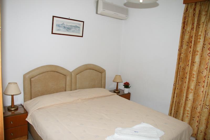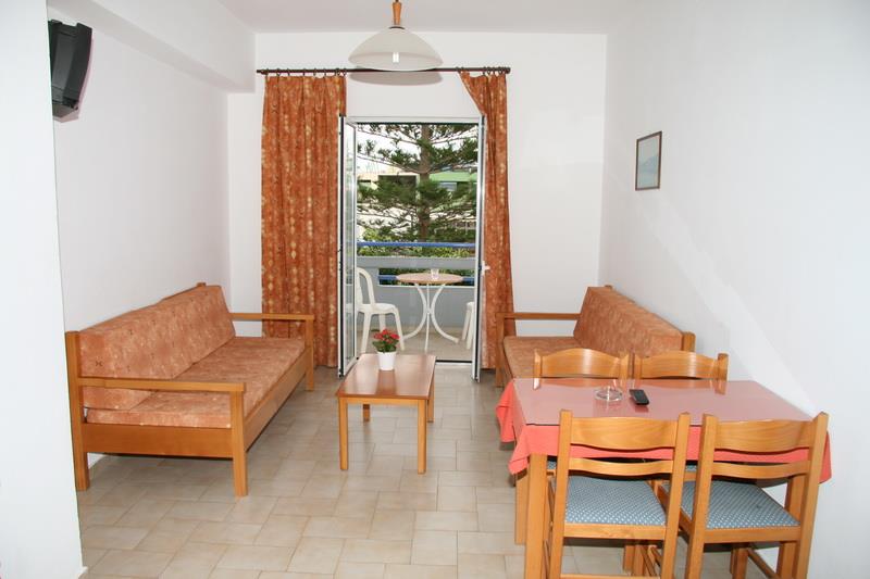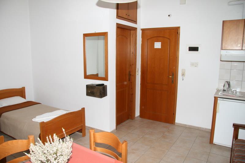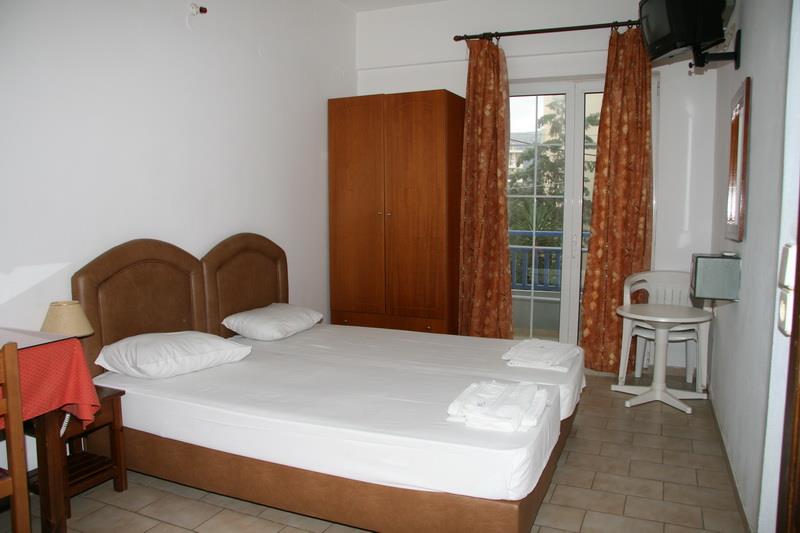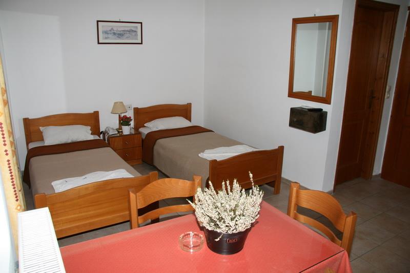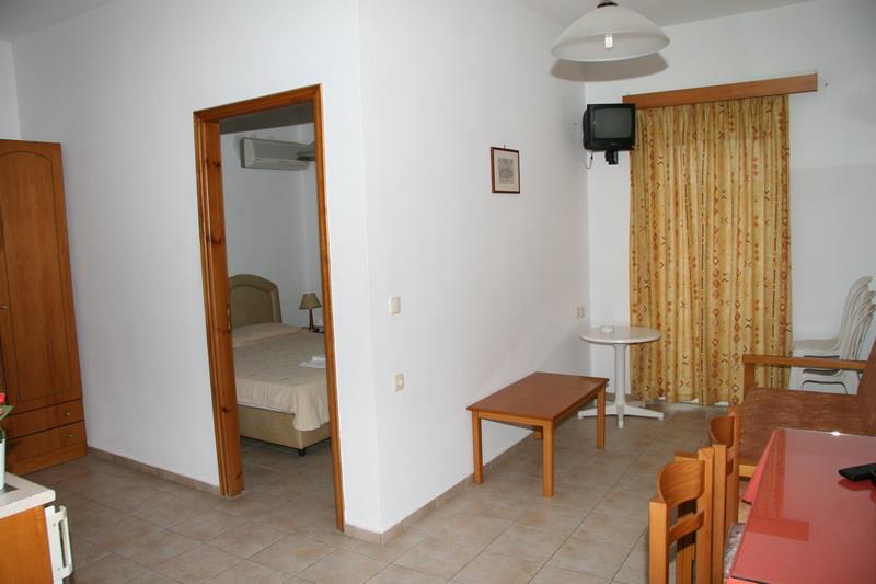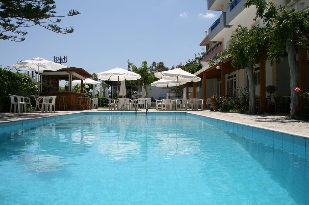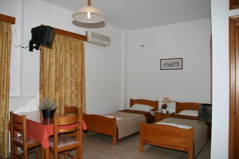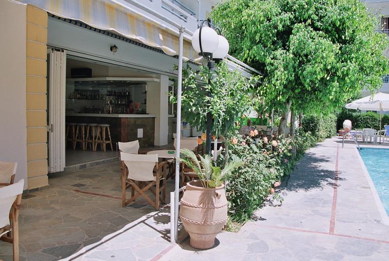 Здание отеля выполнено в традиционном греческом стиле с современными элементами декора. Пятьдесят номеров гостиницы – апартаментов и студий – рассчитаны на размещение от двух до четырех человек. Светлые и просторные, они обставлены новой деревянной мебелью и укомплектованы всем необходимым для комфортного проживания гостей: холодильниками, электрочайниками, телефонами с прямым набором, цветными телевизорами с кабельными и спутниковыми каналами, сейфами и кондиционерами. Также, к услугам постояльцев отдельная ванная комната с чистыми полотенцами и феном.