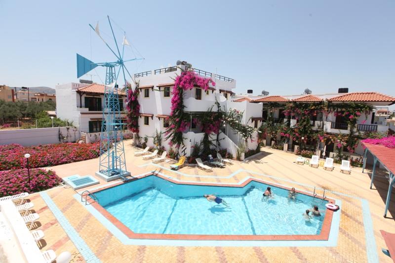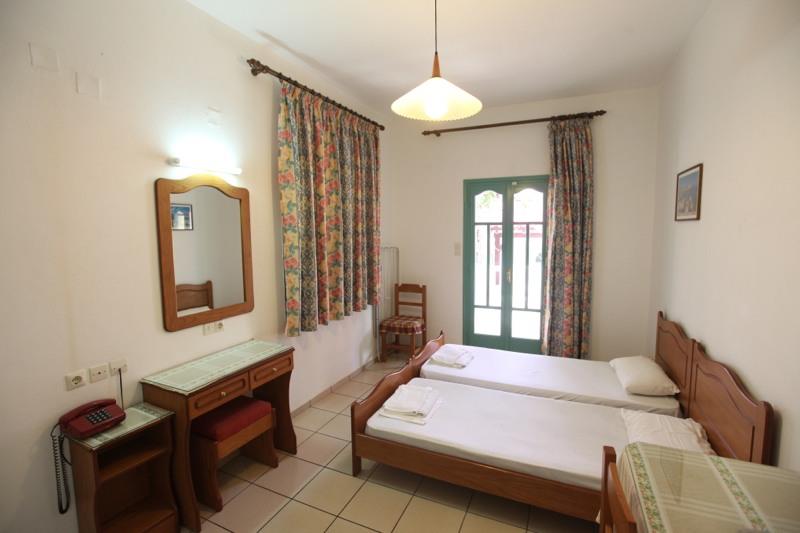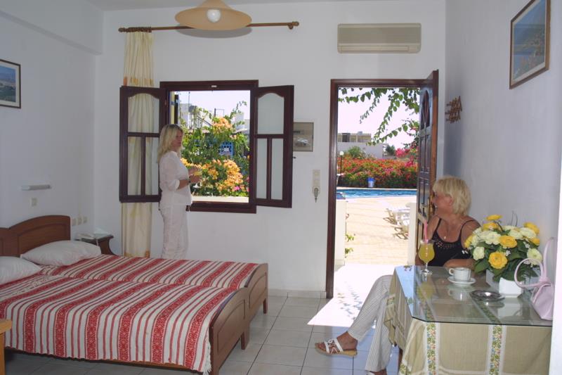 Все сорок два номера оформлены в традиционном критском стиле. В каждых покоях телевизор со спутниковыми каналами, телефон с прямым набором и мини-бар. Пользование кондиционером и сейфом предоставляется за дополнительную плату. Оборудованная плитой, холодильником, посудой и всяческой утварью кухня дает возможность без труда готовить разнообразные блюда. Ванные комнаты в номерах достаточно просторны, с добротной сантехникой, феном и туалетными принадлежностями. С меблированных балконов открываются живописные виды на окрестные пейзажи. В отличие от номеров-студио, в которых две кровати, в двухкомнатных апартаментах еще установлена удобная раскладная диван-кровать в гостиной. Смена постельного белья и уборка номеров проводится ежедневно.