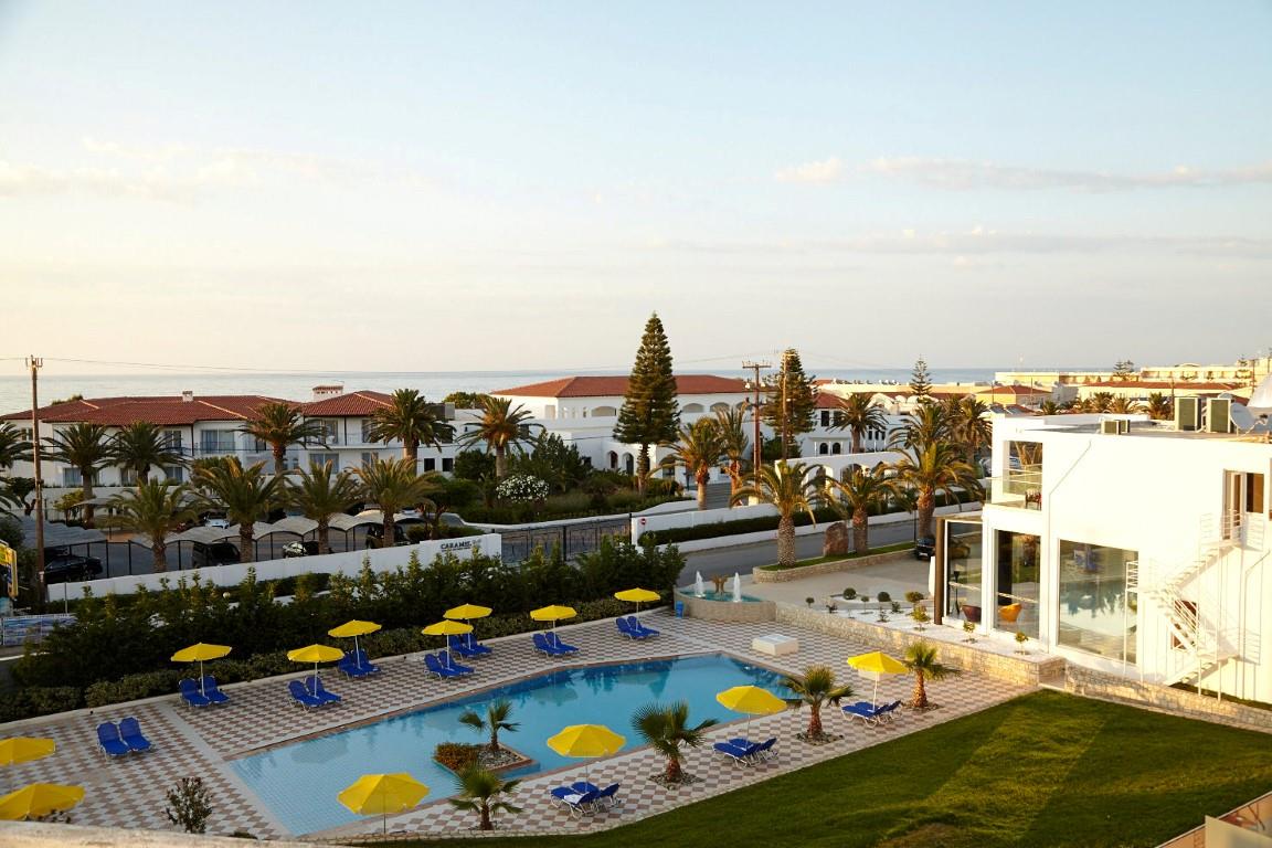 Отель состоит из центрального здания и трехэтажных корпусов под темно-терракотовыми крышами, радующих глаз солнечными светлыми красками стен и четкими линиями традиционной критской архитектуры. Если снаружи строения выглядят отнюдь не помпезно, то зона лобби в главном корпусе поражает богатством убранства и обилием света, который льется не только из больших окон в арочные проемах, но и от хрустальных многоярусных люстр. Природным камнем темно-оливкового цвета облицованы колонны и стойка администратора. Горчичные шторы и светлая мебель гармонируют с полами из белого мрамора. Холлы для отдыха оформлены в аналогичном стиле, который визуально расширяет пространство.