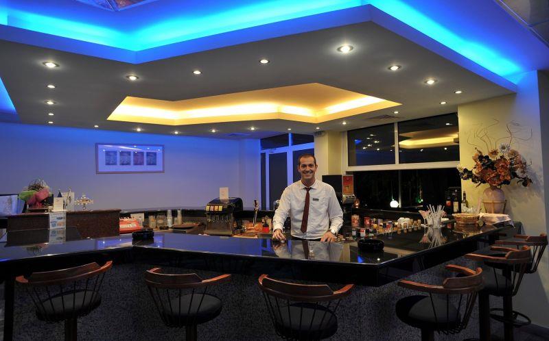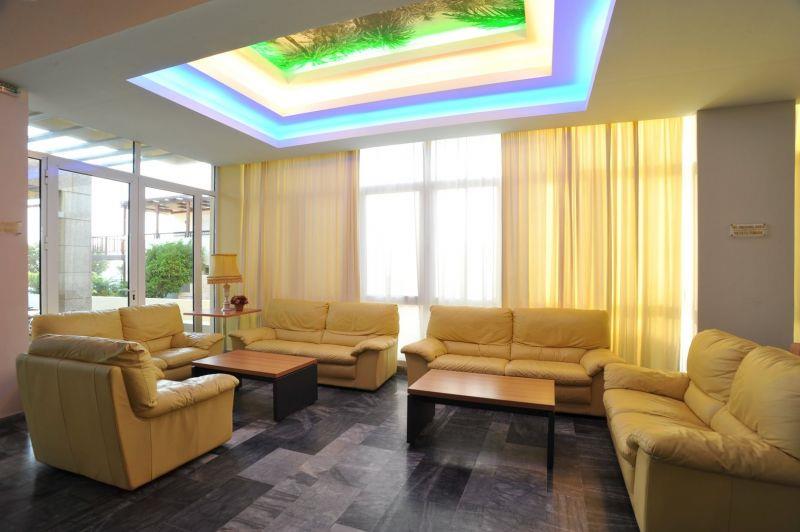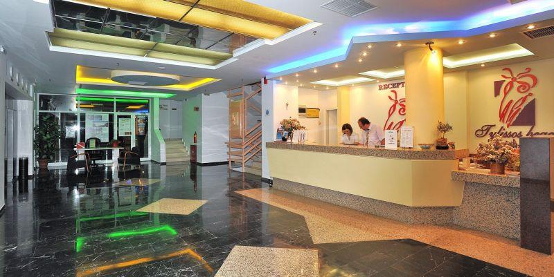 В просторных холлах отеля радует глаз оригинальное оформление потолков, излучающих теплый неоновый свет. Лифт в считанные секунды доставляет постояльцев на нужный этаж.