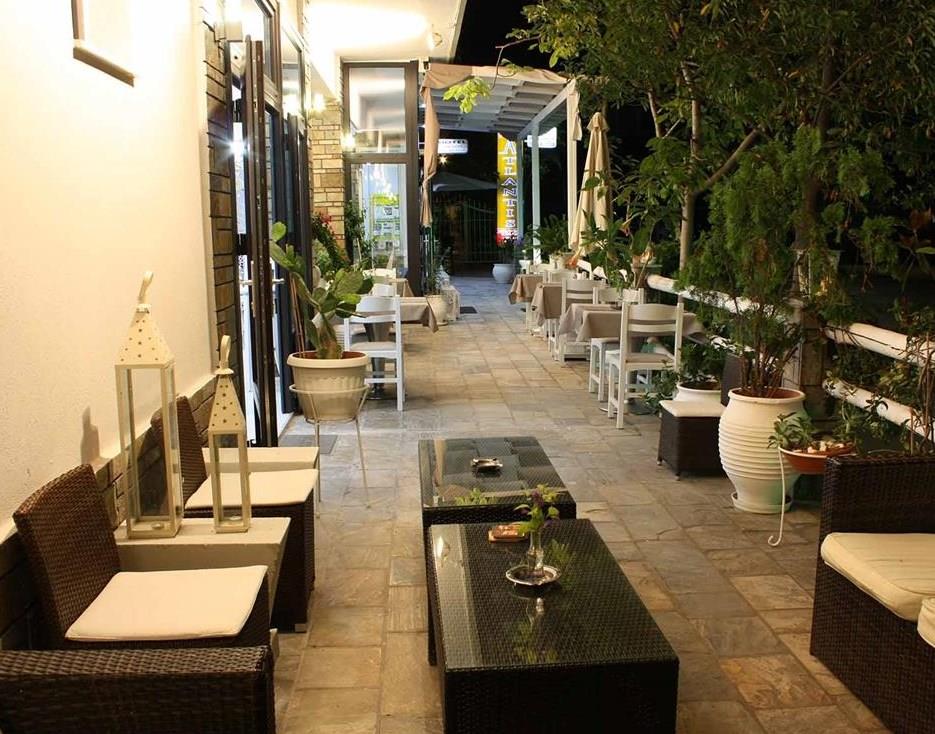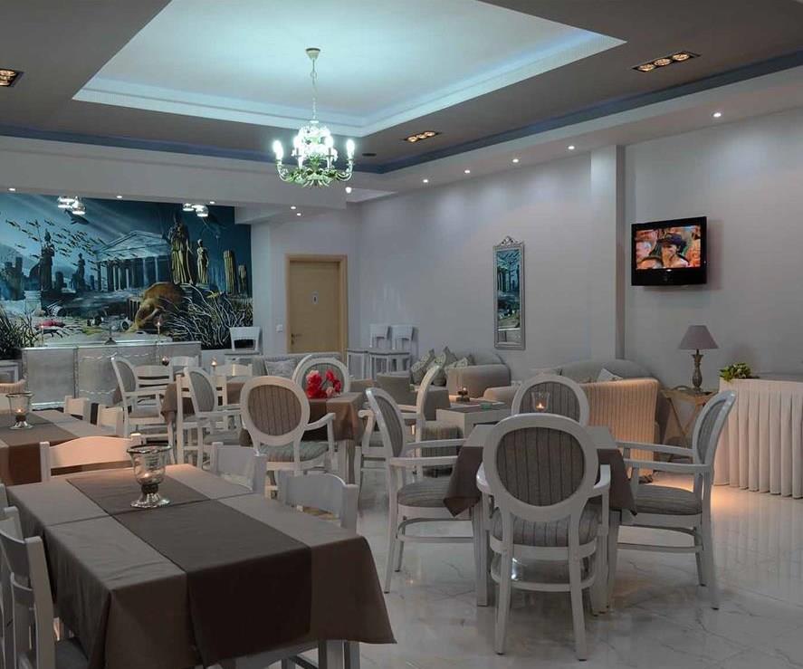 Территория небольшая, с прохладным фойе, кафе-баром и залом для завтраков, включающих в себя привычный для европейцев набор продуктов – ветчина, яйца, джемы, а особой изюминкой являются греческие деликатесы – натуральный йогурт и свежеприготовленная брынза. Столовая с барной стойкой находится в холле. От городского пляжа Atlantis отделяют не более полусотни метров. Лежаки и зонтики платные, однако при заказе закусок или напитков плата не взимается. В течение всего дня постояльцы могут передохнуть от зноя на увитой цветами террасе, под широкими тентами в тени вечнозеленых растений. Здесь же находится и компактный комнатный садик с экзотическими растениями, по утрам столики украшают свежими цветочными композициями, а по вечерам в многочисленных причудливых подсвечниках теплятся веселые огоньки свеч.