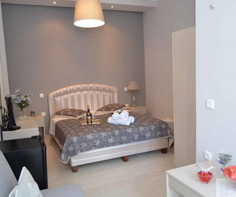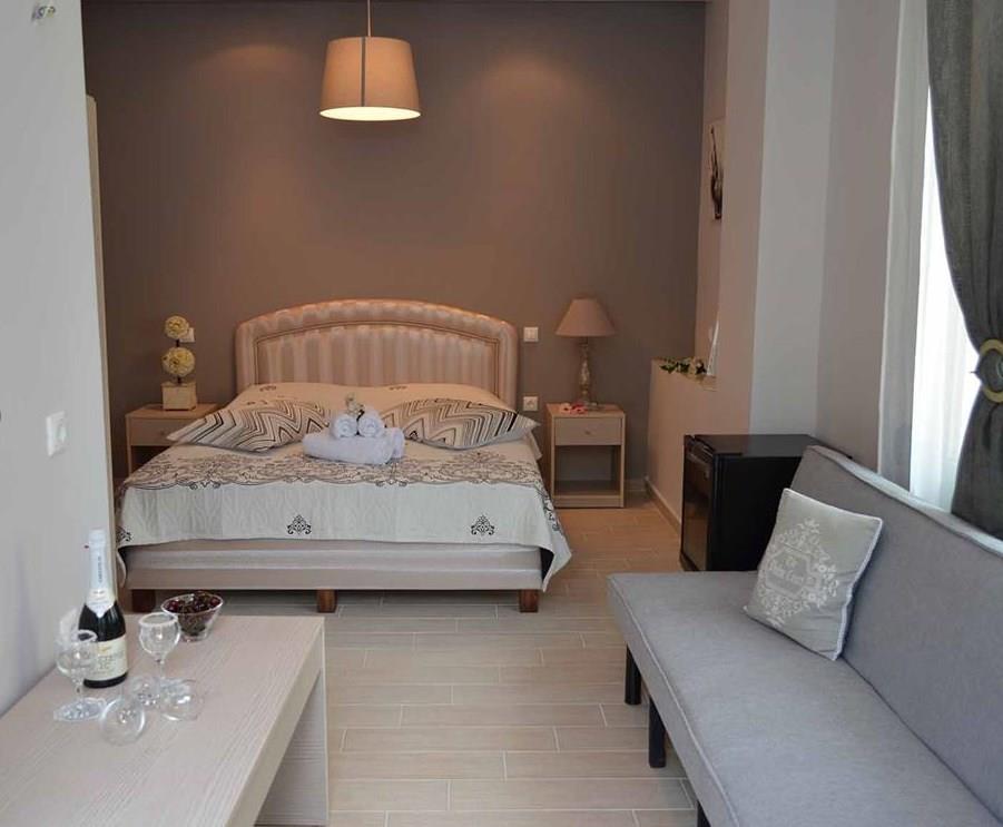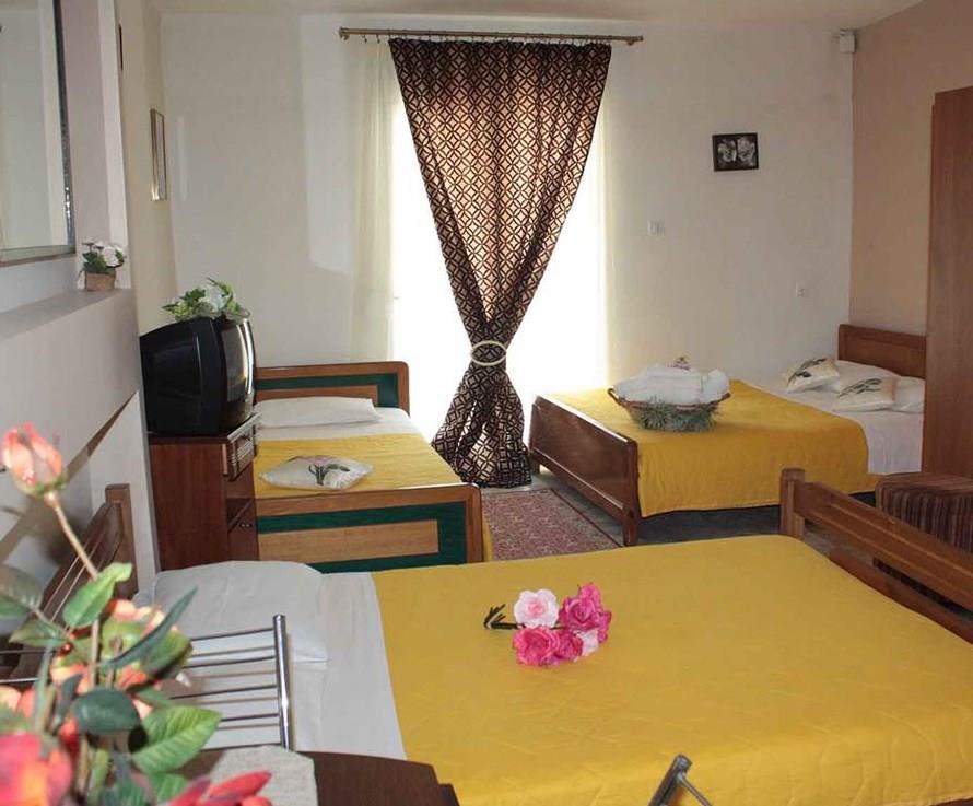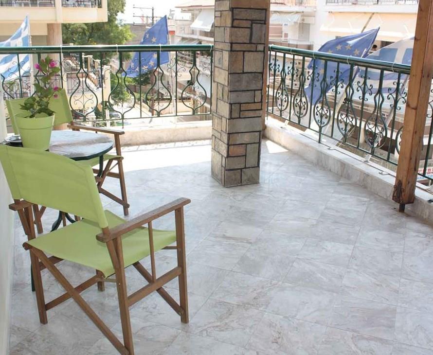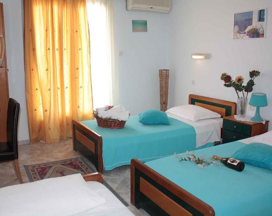 Предусмотрено и размещение семьями по четыре – пять человек, в просторных помещениях с четырьмя спальными местами, ванной комнатой и собственным кухонным уголком. Два семидесятиметровых апартамента вмещают от шести до восьми человек и представляют собой практически отдельную квартиру с двумя спальнями, гостиной-салоном и кухней. Все жилые помещения расположены на втором и третьем этажах, с больших балконов с ажурным металлическим ограждением открывается вид на море или на саму Каликратию. Персонал тщательно следит за чистотой, уборка происходит ежедневно, а смена постельного белья – трижды в неделю.