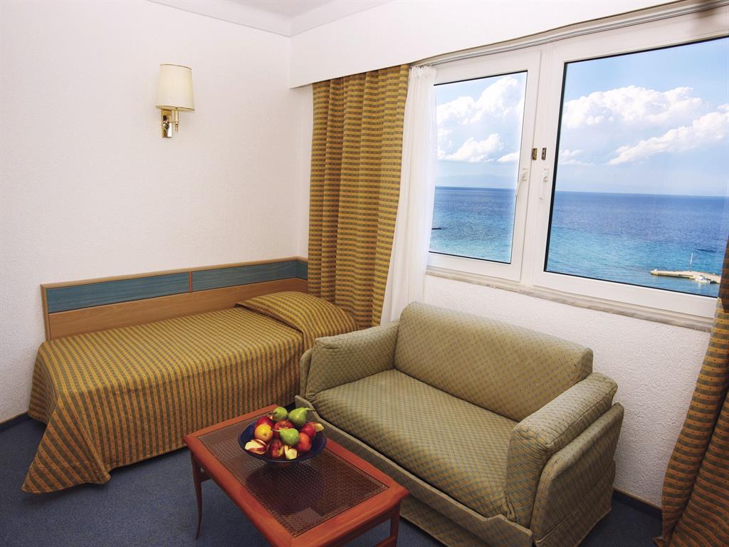 К услугам отдыхающих номера и апартаменты, обставленные удобной современной мебелью. Комнаты оформлены в светлых молочных и янтарных тонах, цветовые акценты создаются напольными покрытиями и отделочными панелями небесного оттенка. Все номера оснащены балконами или террасами, с которых открывается вид на бирюзовое море или красивейшие сады.