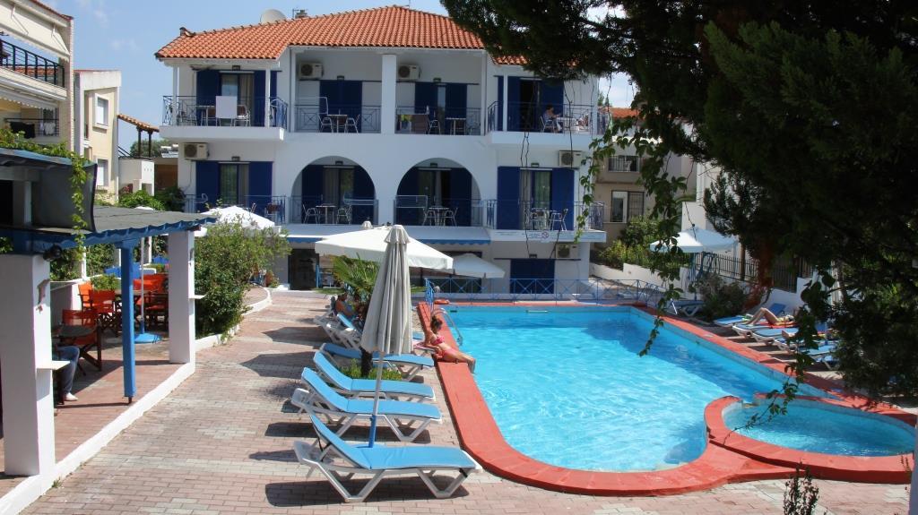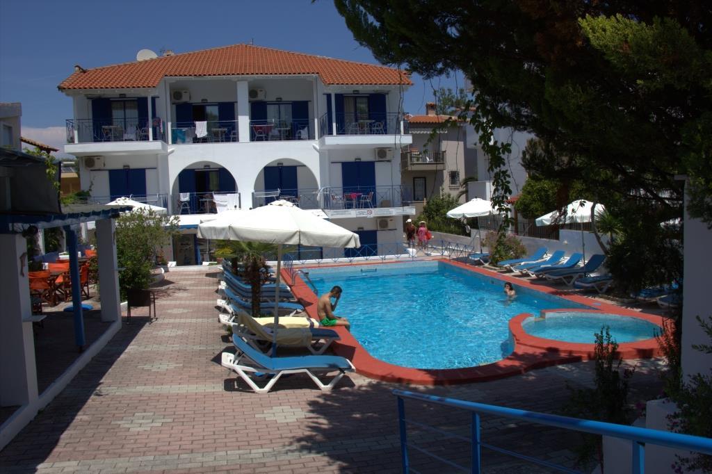 Во дворе находится бассейн с отдельной неглубокой детской зоной, наполненный чистой пресной водой. Принять солнечные ванны или полежать в тени зонта приглашают мягкие шезлонги, разбросанные среди миниатюрных пальм. А на побережье ждет песчано-галечный пляж с лежаками, принадлежащий соседнему Hanioti Grand Hotel, и лазурные волны Средиземного моря. Услуга проката спортивного оборудования – это настоящая «манна небесная» для приверженцев активного досуга. Виндсерфинг захватывает дух, а дайвинг или снорклинг знакомят с потрясающим подводным миром царства Посейдона. Любители странствий арендуют застрахованные автомобили и отправляются в захватывающее путешествие по живописным уголкам полуострова – жемчужине Халкидик. Среди туристов неизменной популярностью пользуются руины храма Зевса Амона, возведенного в четвертом веке до нашей эры. Местность считается заповедником и открыта для свободной демонстрации найденных во время раскопок артефактов, скульптур, остатков античных святынь.