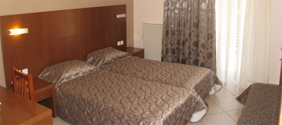 Гостиница располагает тридцатью восемью комфортабельными номерами, в составе которых стандартные и улучшенные одно-, двух- и трехместные, а также апартаменты для людей с ограниченными физическими возможностями. Комнаты не отличаются какими-либо особенными элементами декора или дизайнерскими изысками – все просто, функционально и достаточно уютно: одноместные кровати, которые, сдвигаясь, образуют поистине королевское ложе, деревянные стулья, косметический стол и прикроватные тумбочки с бра у изголовья. Стены выкрашены в нежные пастельные тона или декорированы вставками из материи. Каждый номер оснащен кондиционером, централизованным отоплением, спутниковым телевидением с большим выбором развлекательных каналов, DVD-проигрывателем, беспроводным интернетом, мини-холодильником, телефоном и небольшим электронным сейфом. Всем постояльцам предлагаются удобные банные халаты и мягкие тапочки. Вместительные меблированные балконы открывают идиллический вид на тихое лазурное побережье или буйную зелень внутреннего дворика. В ванных комнатах сверкает кафельное покрытие и белоснежная сантехника; ванна или душевая кабинка в зависимости от комплектации. Также есть набор необходимых банно-туалетных принадлежностей, большое зеркало, полочка для косметики и фен. Обслуживающий персонал неплохо знает английский и русский языки; влажная уборка производится ежедневно, замена белья – один раз в три дня.