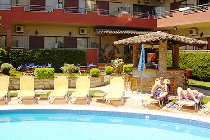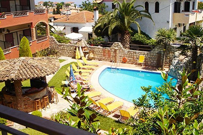Вниманию постояльцев отеля Zeus предлагаются двадцать четыре номера, на втором этаже разместились двухместные студии и четырехместные апартаменты – уютные, выдержанные в нежных, пастельных тонах, со всеми современными удобствами. Обстановка комнат дополнена такими привычными атрибутами комфорта, как кухонный уголок, холодильник, полный набор кухонной утвари, телевизор, двухконфорочная электроплита и электрочайник. Сейф находится на стойке администрации, и его использование оплачивается дополнительно. С просторных балконов верхних этажей открываются красочные виды на небесно-голубую лазурь бассейнов и морские пейзажи. Постояльцы нижних помещений наслаждаются тенью деревьев и ароматами живых цветов, высаженных по территории отеля.
