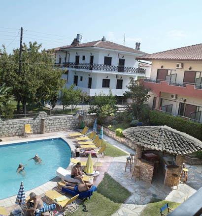 Отель Zeus расположен в традиционной деревне Афитос, на восточном побережье полуострова Кассандра. Дорога до отеля из аэропорта города Салоники занимает около часа, поскольку трансфер на автобусе, из-за скромных размеров улиц Афитоса, плавно перетекает в поездку на такси. Отель представляет собой уютную двухэтажную частную гостиницу. Территория ее замкнута зданиями, сходящимися буквой «Г». Гостиничный комплекс построен с таким расчетом, чтобы создавать впечатление романтичной островной усадьбы. Во внутреннем дворике есть небольшой бассейн с кристально чистой водой, где хорошо в зной провести время под сенью раскидистых зонтов, на шезлонгах, с книжкой или бокалом прохладительного напитка в руках. Бар у бассейна тоже открывает двери гостям и зовет отведать напитки в непринужденной атмосфере.