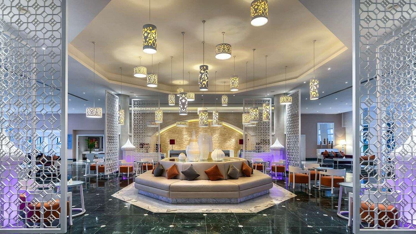Номера оформлены с нотками восточного колорита – присутствуют резные светильники, фигурные проемы, самобытные орнаменты и сочные краски текстиля, которые отлично сочетаются с современными атрибутами комфорта, такими как: телевизоры с плоским экраном, системы климат-контроля.