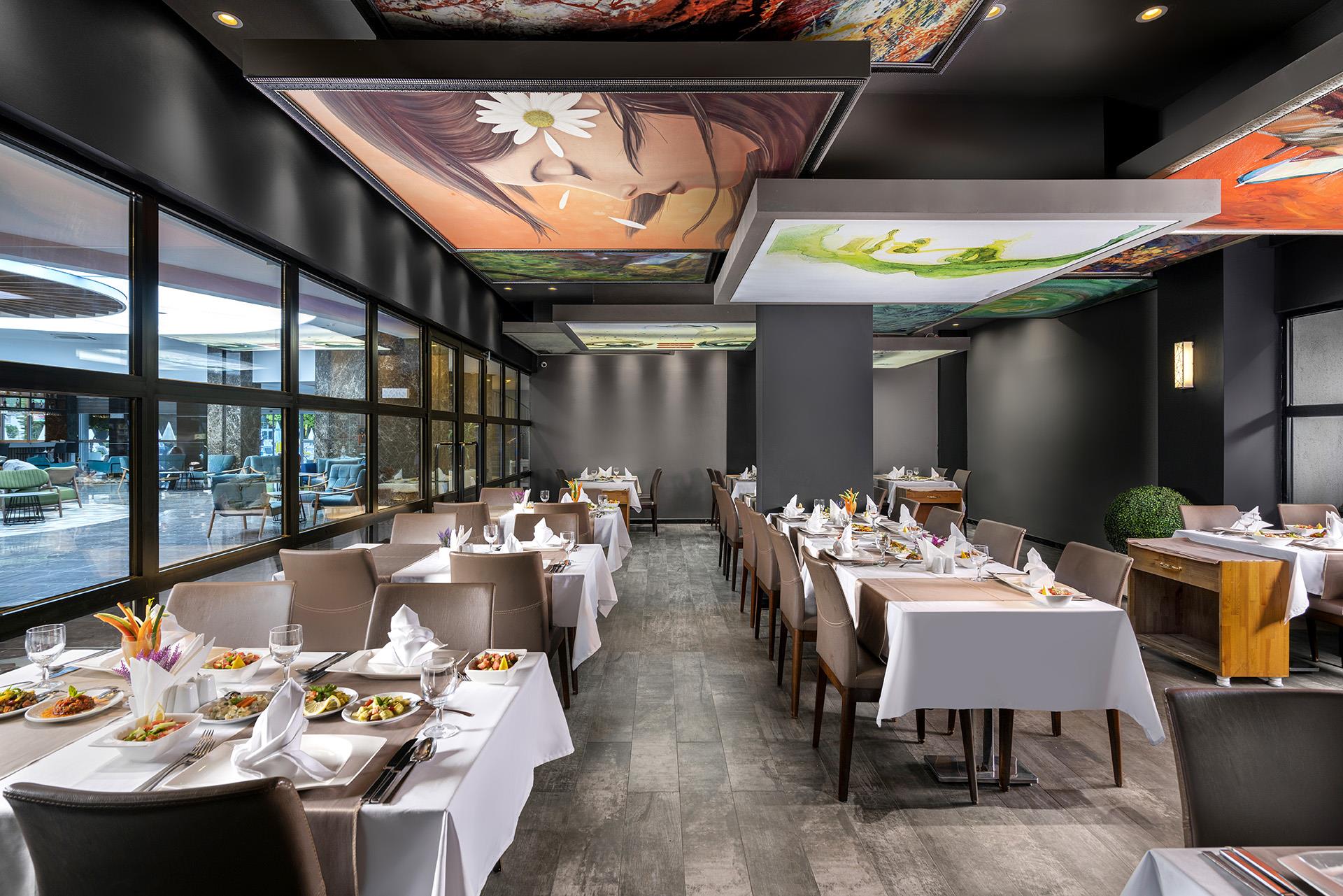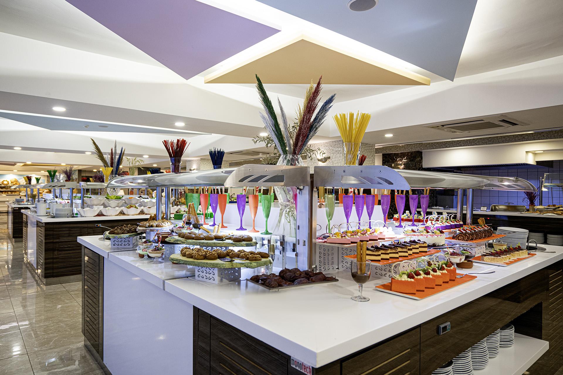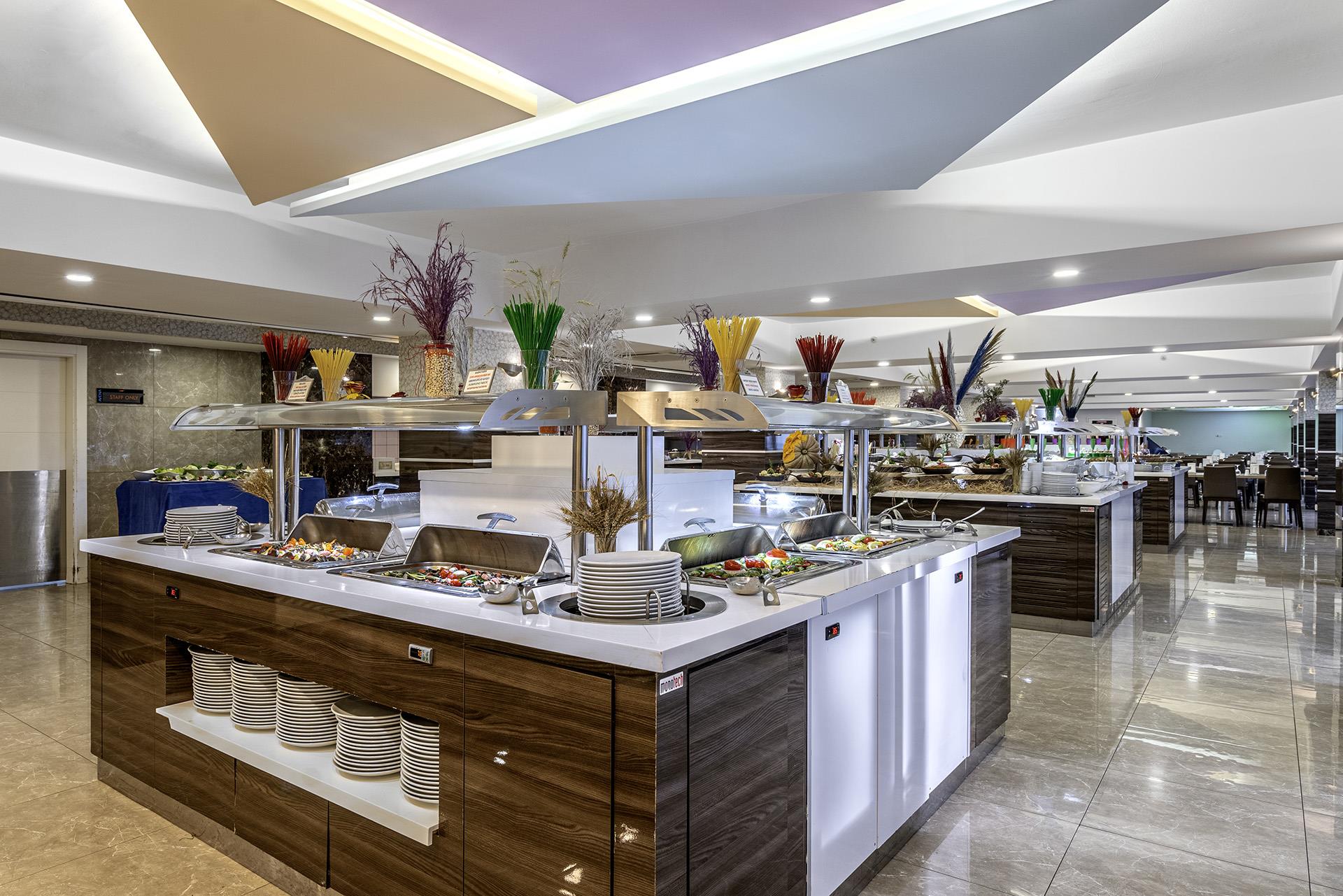 Питание в отеле организовано по системе все включено, разнообразные блюда интернациональной кухни и напитки местного производства позволяют утолить голод в течение дня. В качестве промежуточных трапез предлагаются традиционные турецкие лепешки гезлеме и настоящая итальянская пицца. Насладиться едой можно как в обеденном зале, так и на открытой террасе рядом с бассейном. В течение дня бар предлагает широкий выбор алкогольных коктейлей, а также чая, кофе и соков.