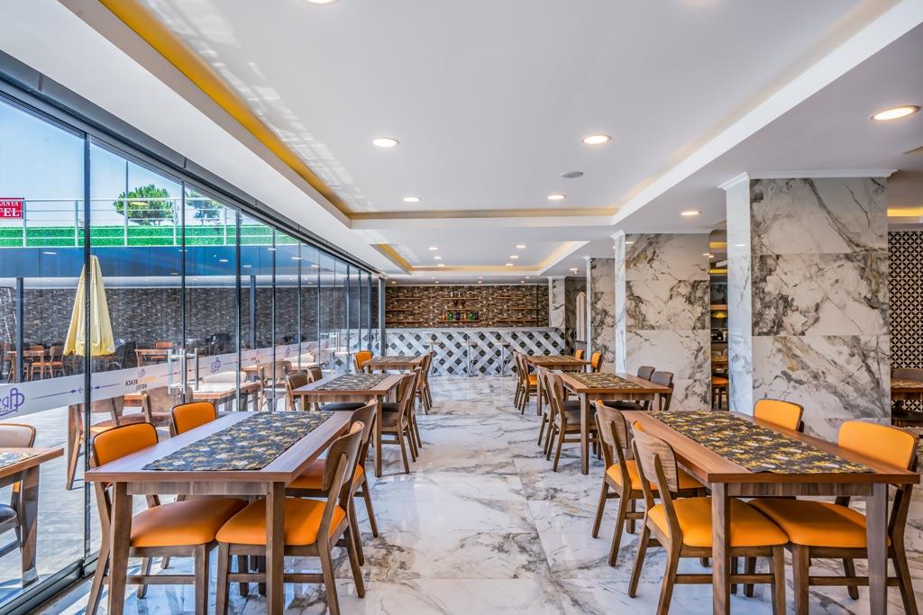 Ежедневно на открытой террасе у бассейна сервируется завтрак "шведский стол". На ужин в полуоткрытом ресторане отеля Dim Suit на верхнем этаже подают блюда турецкой и интернациональной кухни.