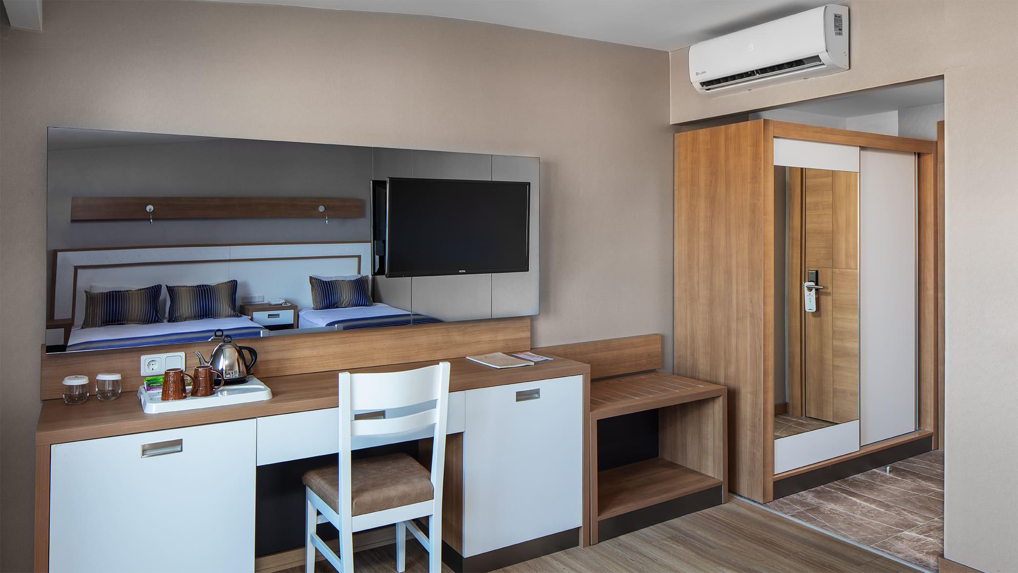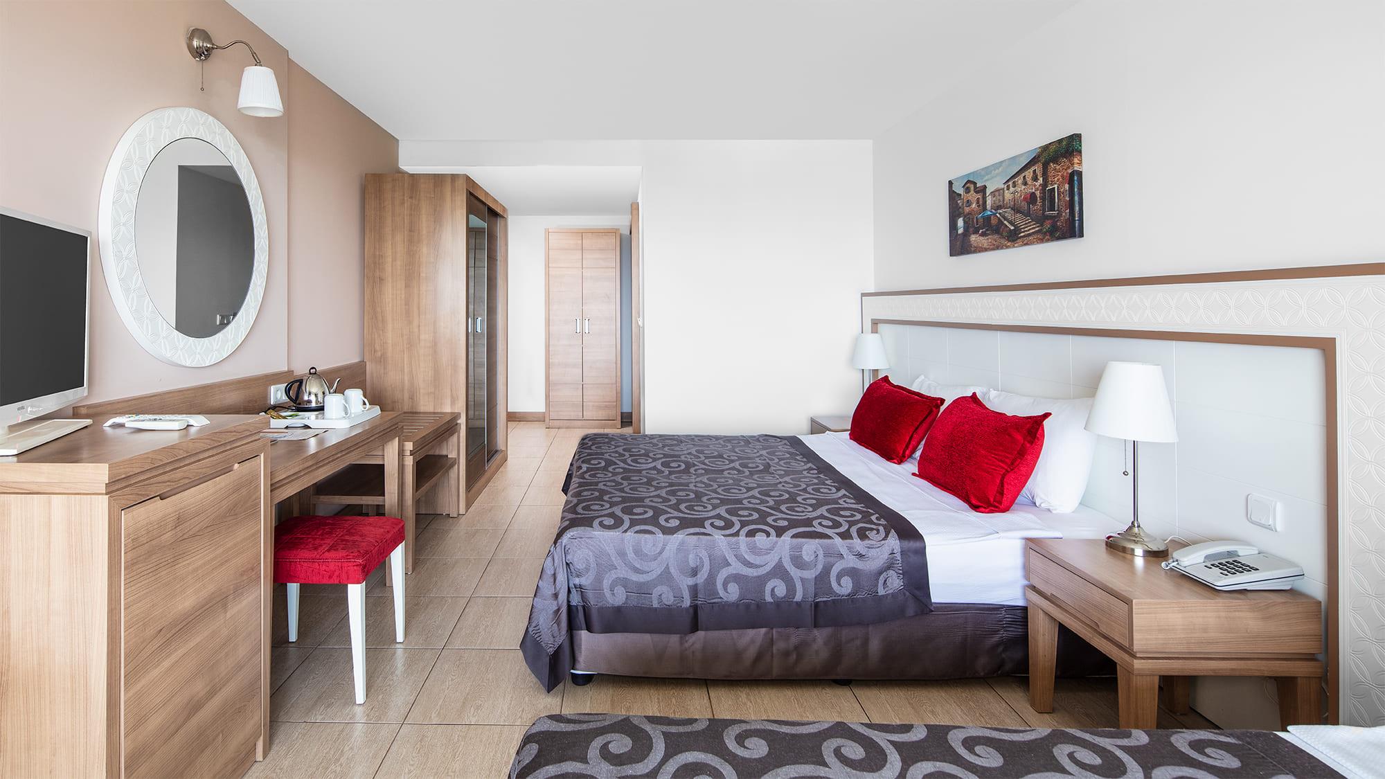 Почти три сотни номеров отеля радуют глаз сочетанием естественных светлых тонов и ярких акцентов в текстиле. Обстановка современна и элегантна, а набор удобств мало различается по категориям. Везде работают сплит-кондиционеры, телефоны прямой связи, спутниковое телевидение, беспроводной интернет. Ванные оснащены фенами и полноценными ваннами. На полу паркет и ковры. Прохладительными напитками потчуют мини-бары, а ценности и документы сохраняют в неприкосновенности цифровые сейфы. В семейных покоях пространство спален разграничивается визуально – при помощи портьеры, а люксы состоят из двух отдельных комнат с общей ванной. Балконы неизменно открывают захватывающий дух вид на море.