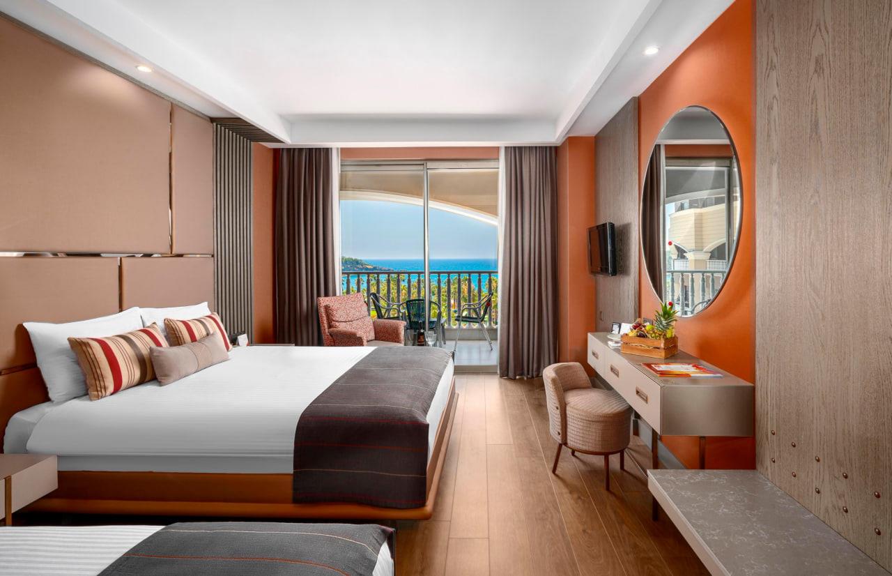 - 315стандартных номеров (максимальное размещение 2+2, жилая площадь 29кв.м.221 номер с видом на море, 95 номеров с видом на сад;