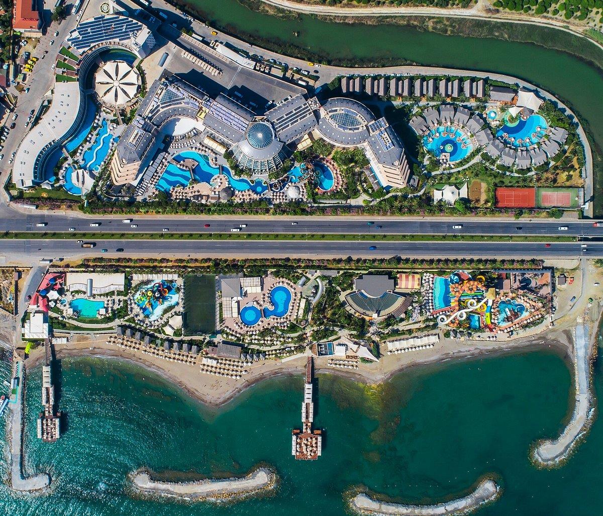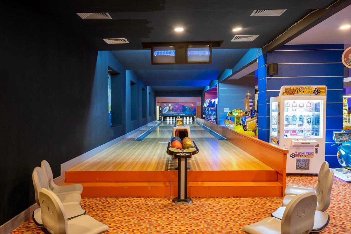 Современный отель с большой территорией. Настолько большой, что тут нашлось место и аквапарку, и нескольким ресторанам и барам, и SPA-центру, и площадкам для игры в футбол и теннис… Здесь даже есть кинотеатр и боулинг!