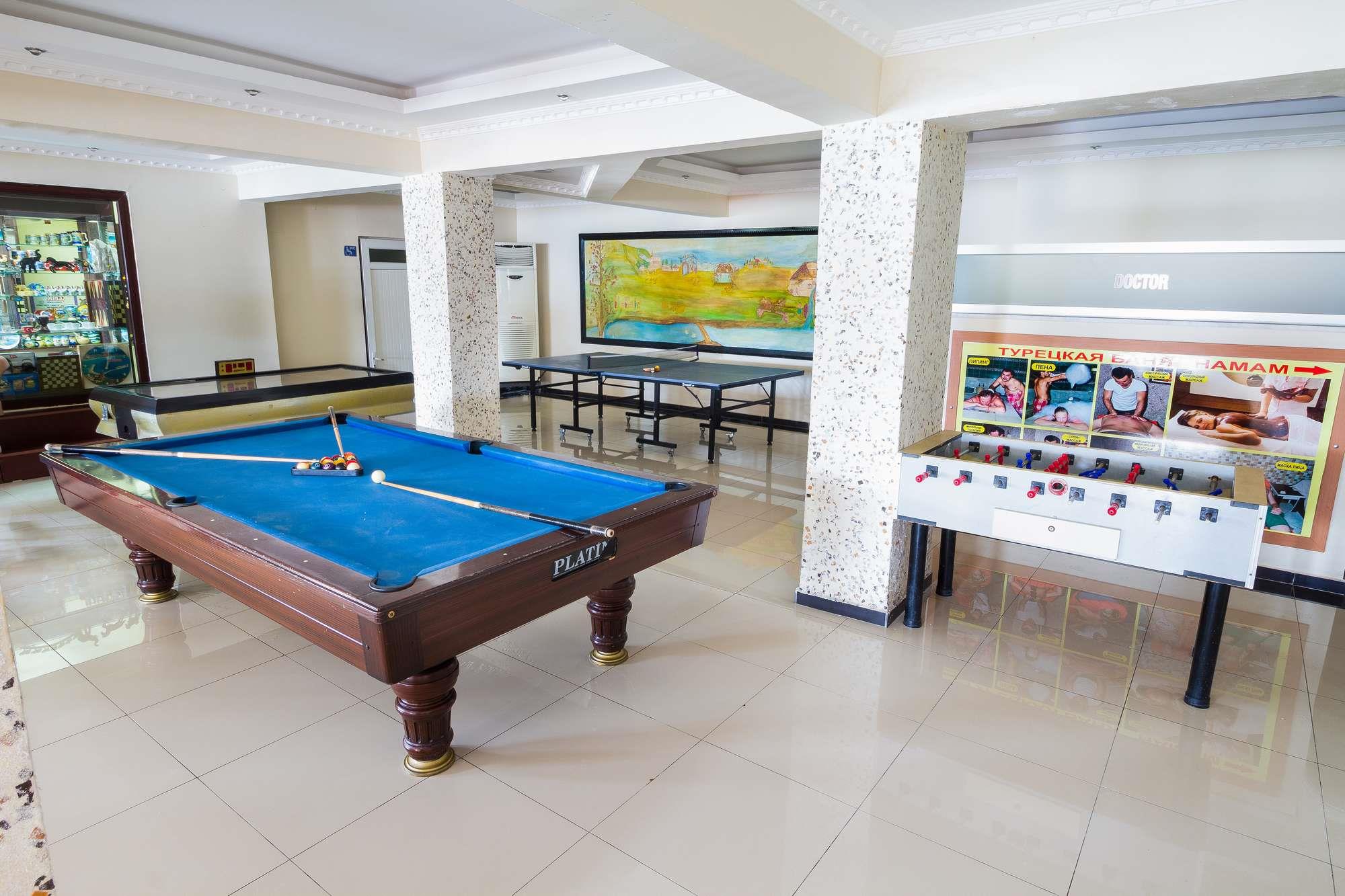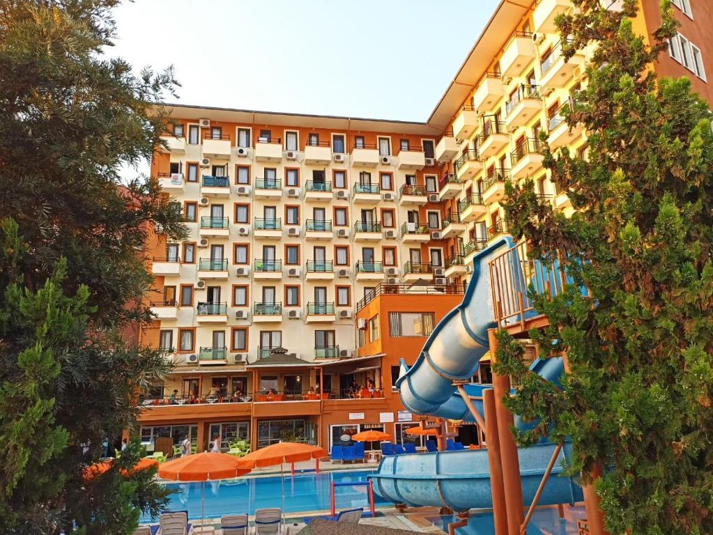 Территория отеля небольшая, но очень уютная и ухоженная. Здесь расположен большой открытый бассейн с водными горками, которые работают три раза в день по одному часу. Для маленьких гостей отеля предусмотрены отдельный водоем, а также игровая площадка с качелями и горками. В зоне лобби предоставляется беспроводной интернет.