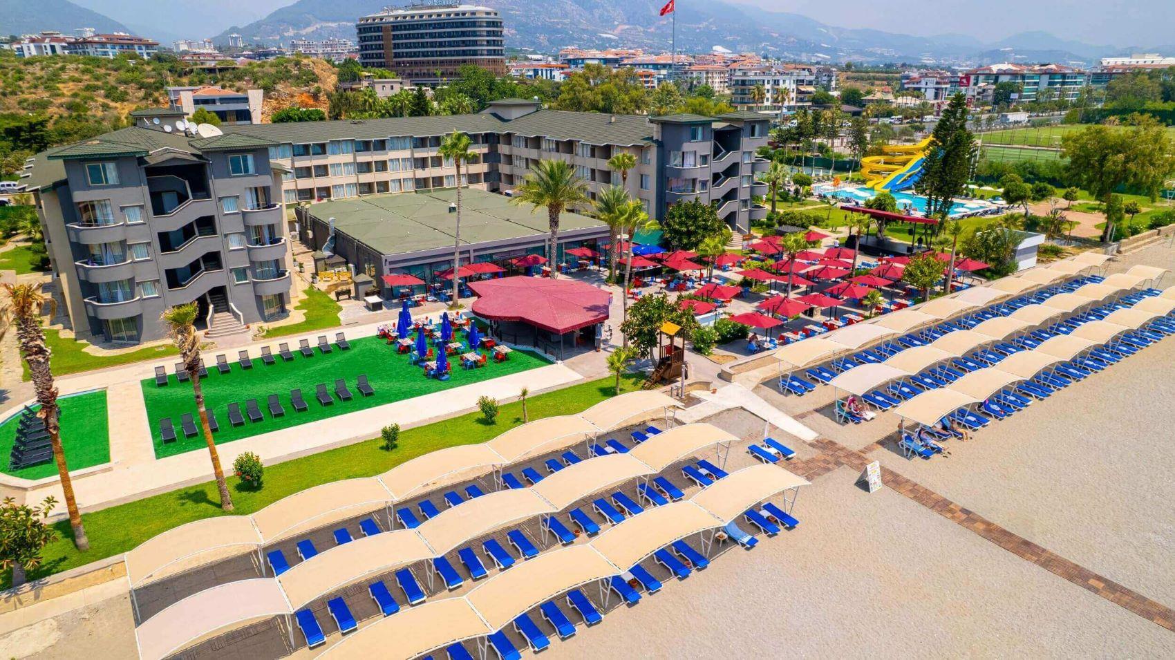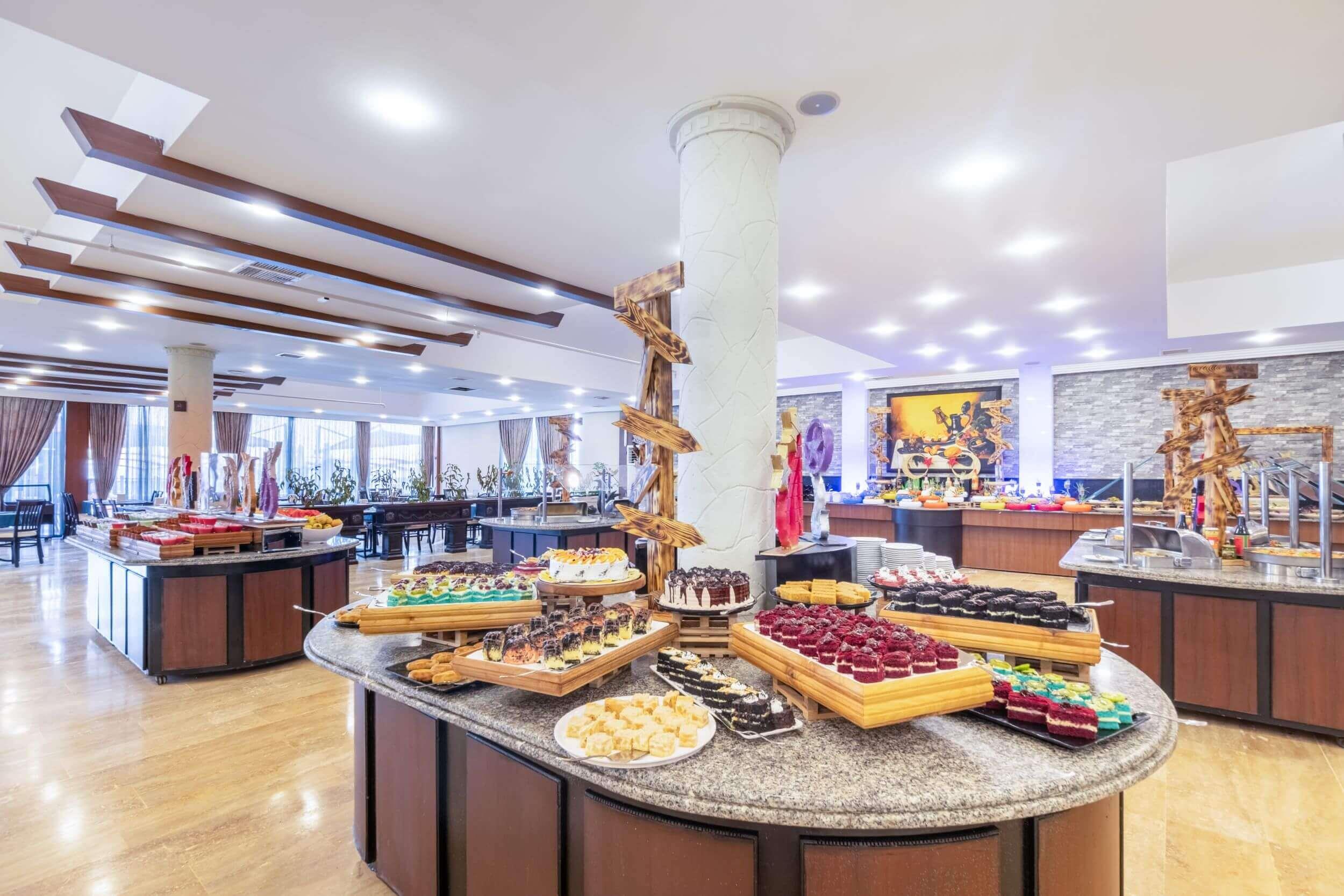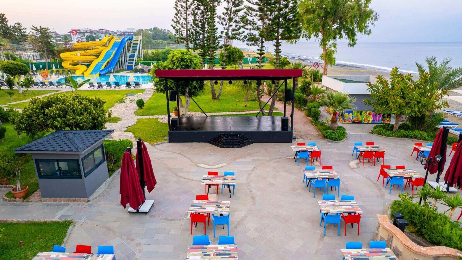 1 открытый ресторан (300 персон), 1 крытый ресторан (450 персон), 5 баров, 1 конференц-зал (400 кв.м), 2 открытых бассейна (314/329 кв.м.), аквапарк (3 горки, ч.р. 10:00-12:00/14:00-18:00), 1 теннисный корт с жестким покрытием, 1 теннисный корт с ковровым покрытием, парикмахерская, прачечная, сейф на ресепшн (платно), лифт, анимация, персонал отеля владеет немецким, русским и английским языками.