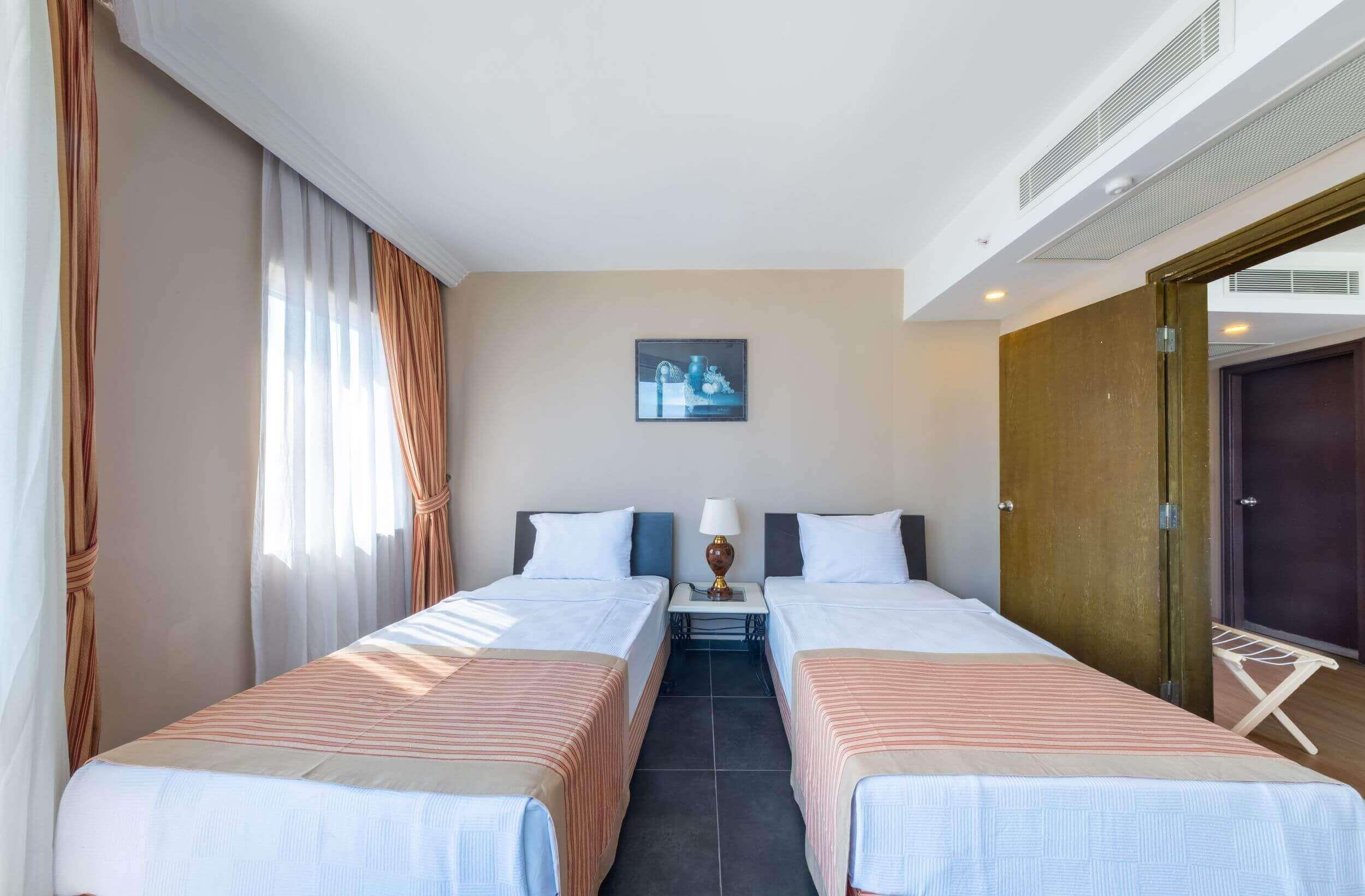 203 стандартные комнаты с видом на море (22 кв. м), 20 стандартных комнат с видом на сад (22 кв. м), 20 коннекшн комнат (44 кв.м, макс. 2+1 чел.), 16 семейных комнат (38 кв.м, макс. 2+1 чел.).