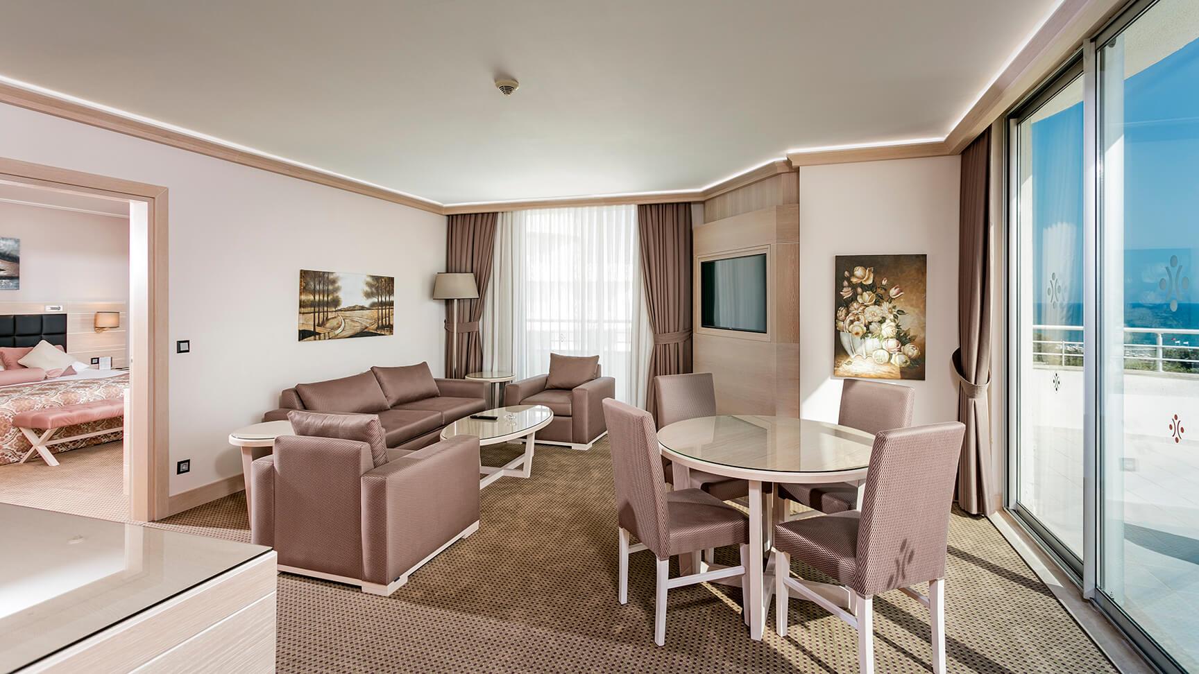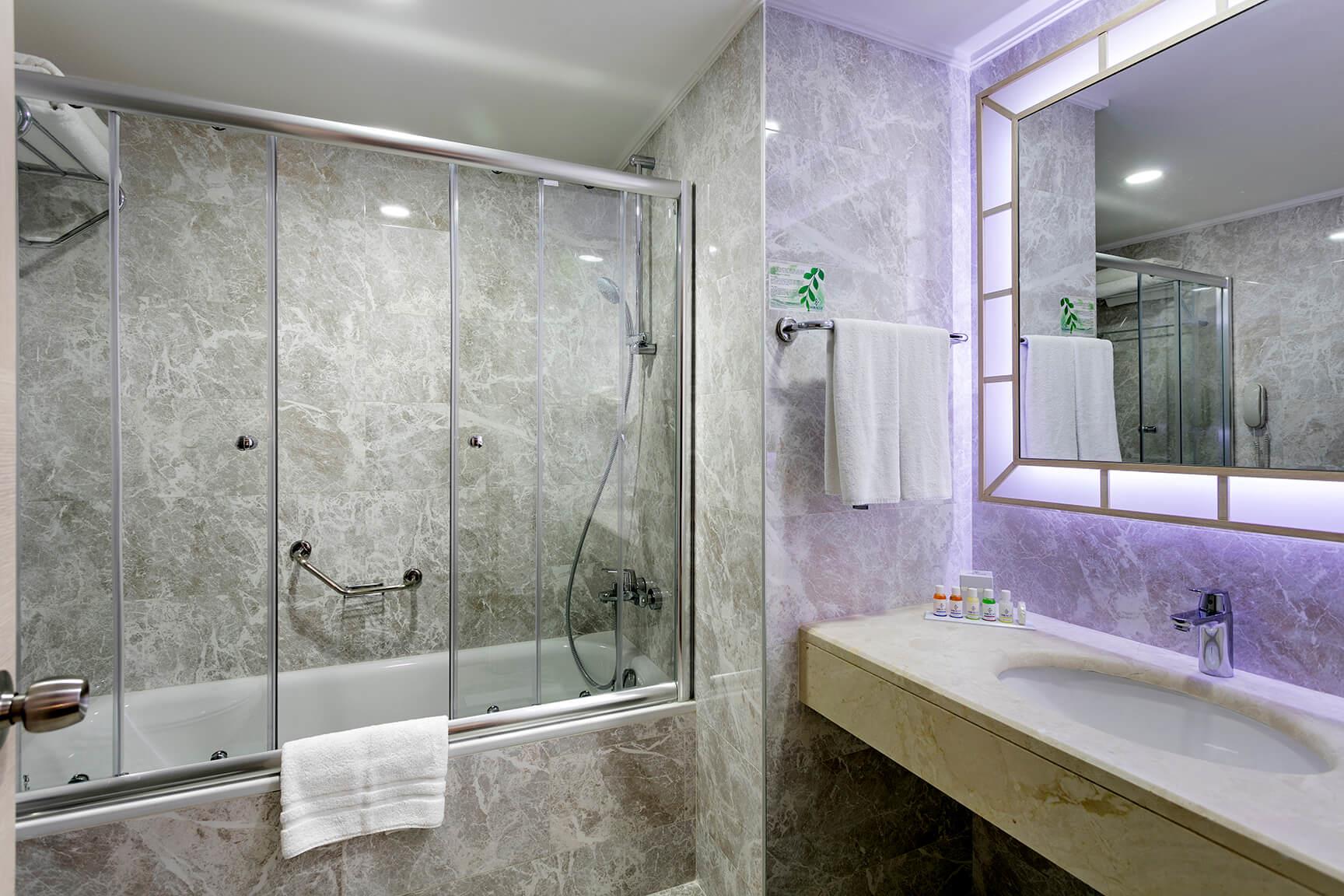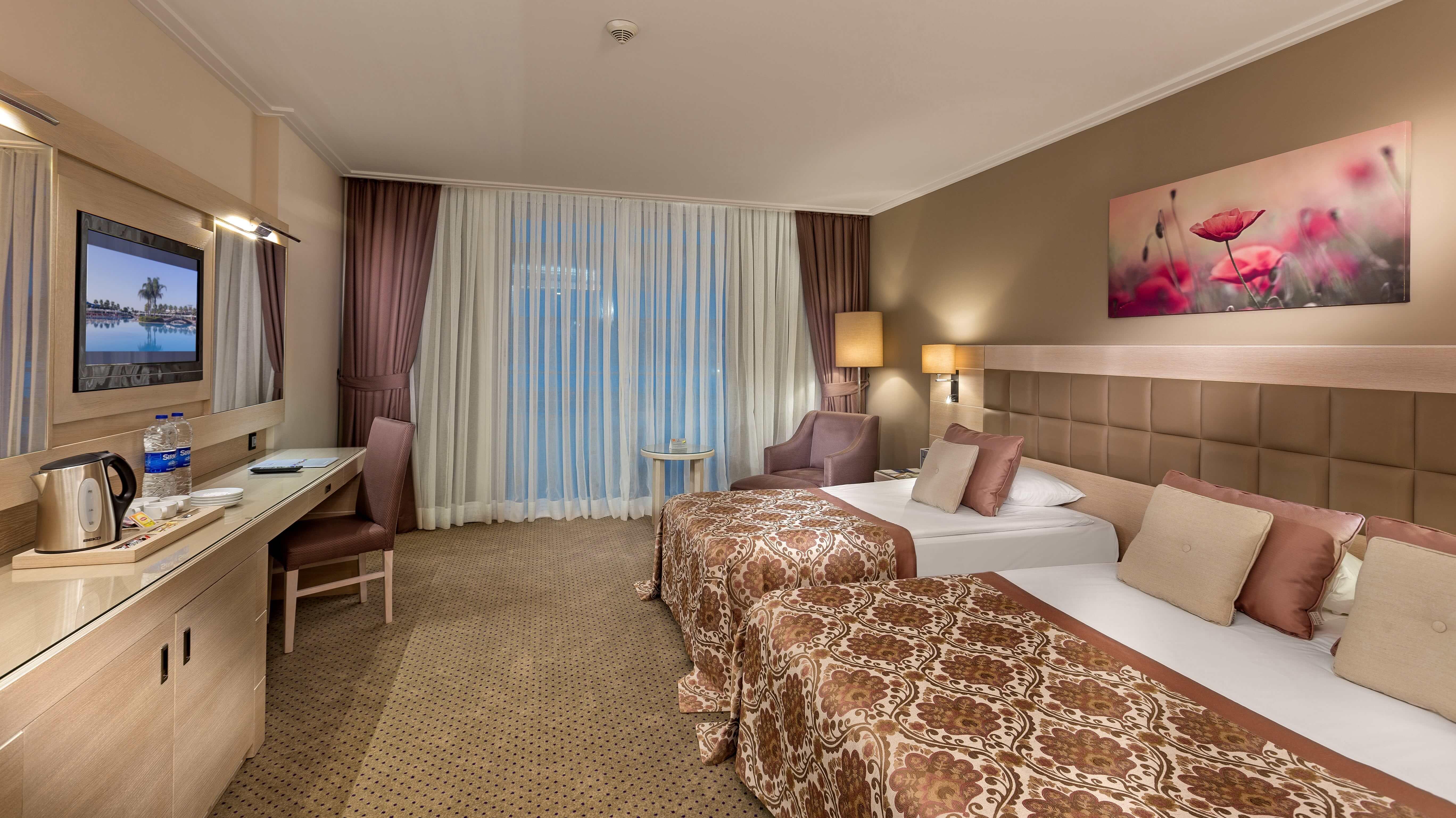 Персонал ежедневно заботится о чистоте комнат. Уборка и смена полотенец осуществляется каждый день, а смена постельного белья – 3 раза в неделю. На территории отеля расположены бассейны с водными горками, салон красоты, несколько конференц-залов, торговый комплекс с различными бутиками.