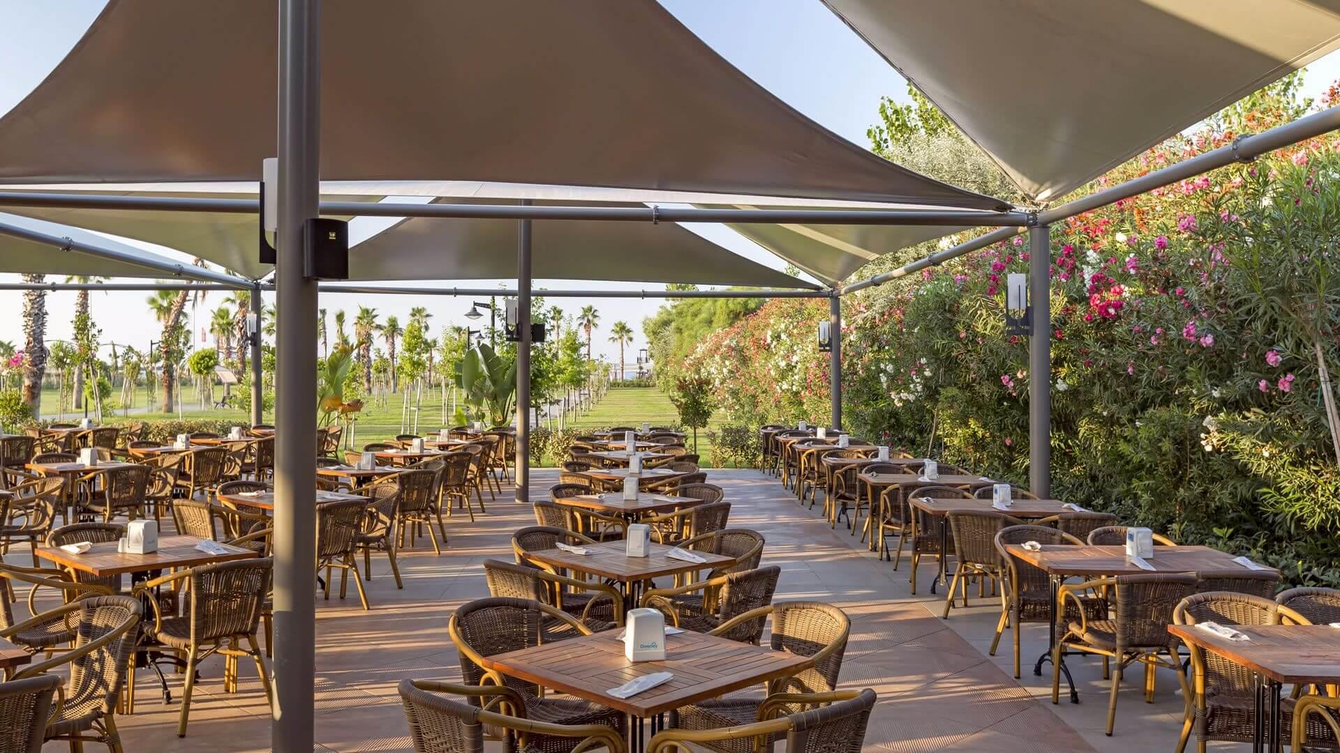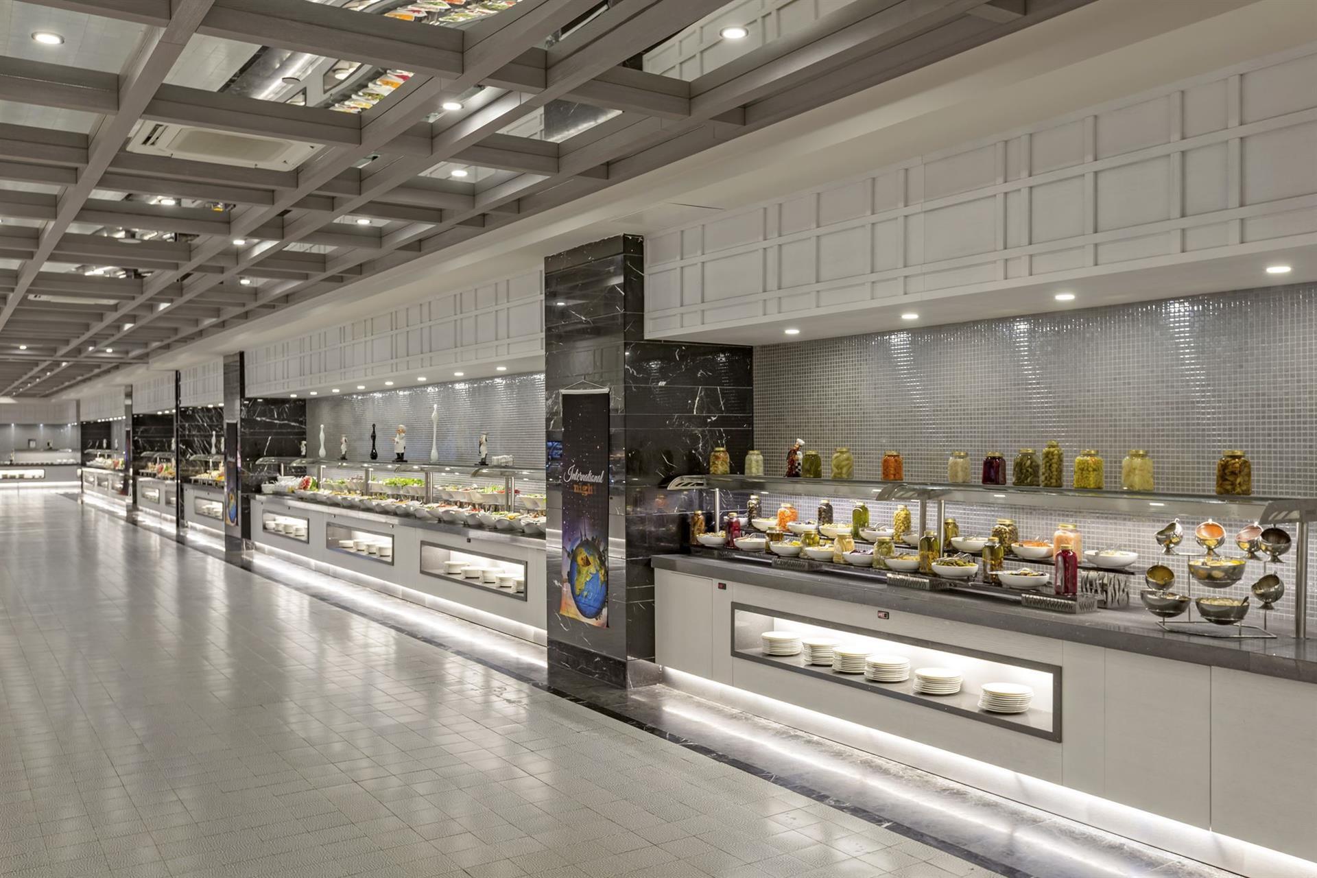 На территории комплекса находятся 15 ресторанов и 9 баров. В главном ресторане Seginus накрывают завтрак, обед и ужин в формате шведский стол, есть отдельное меню для детей. Доставка еды и напитков в номер является платным сервисом.