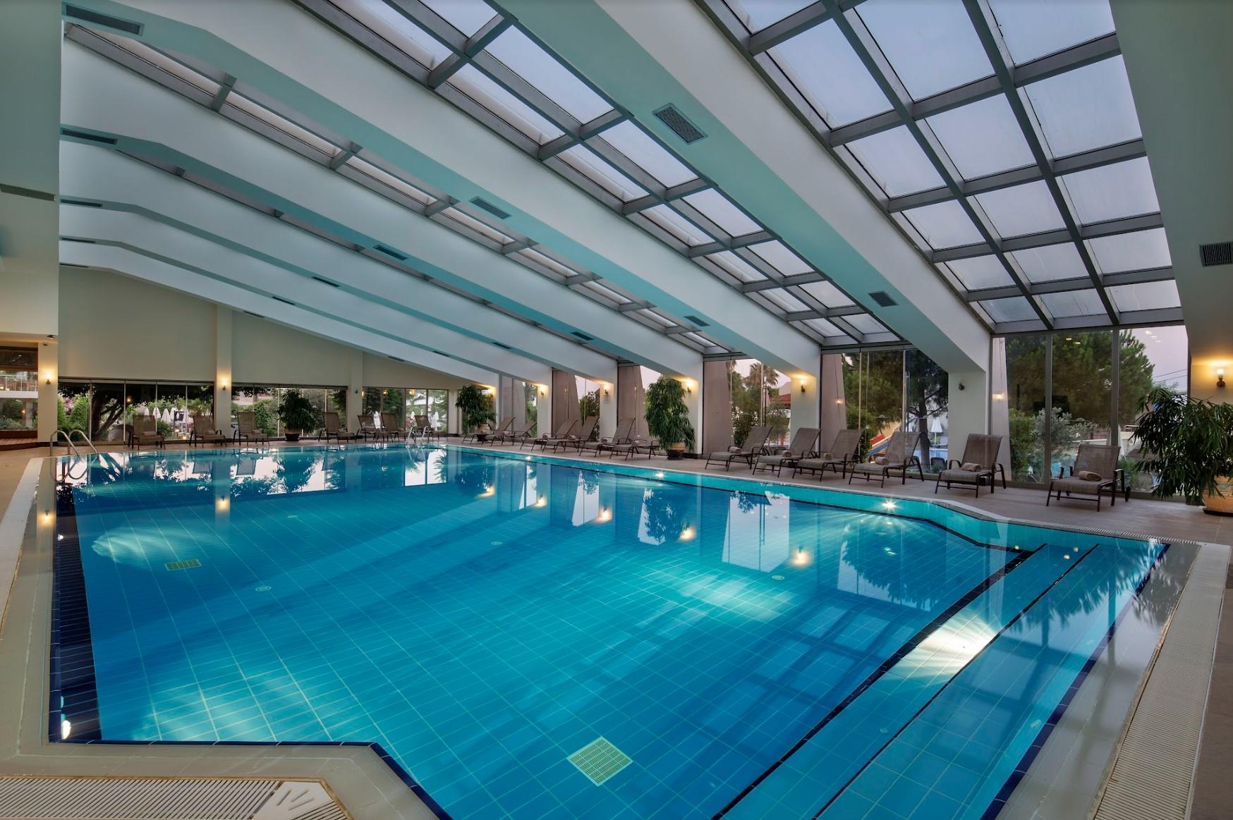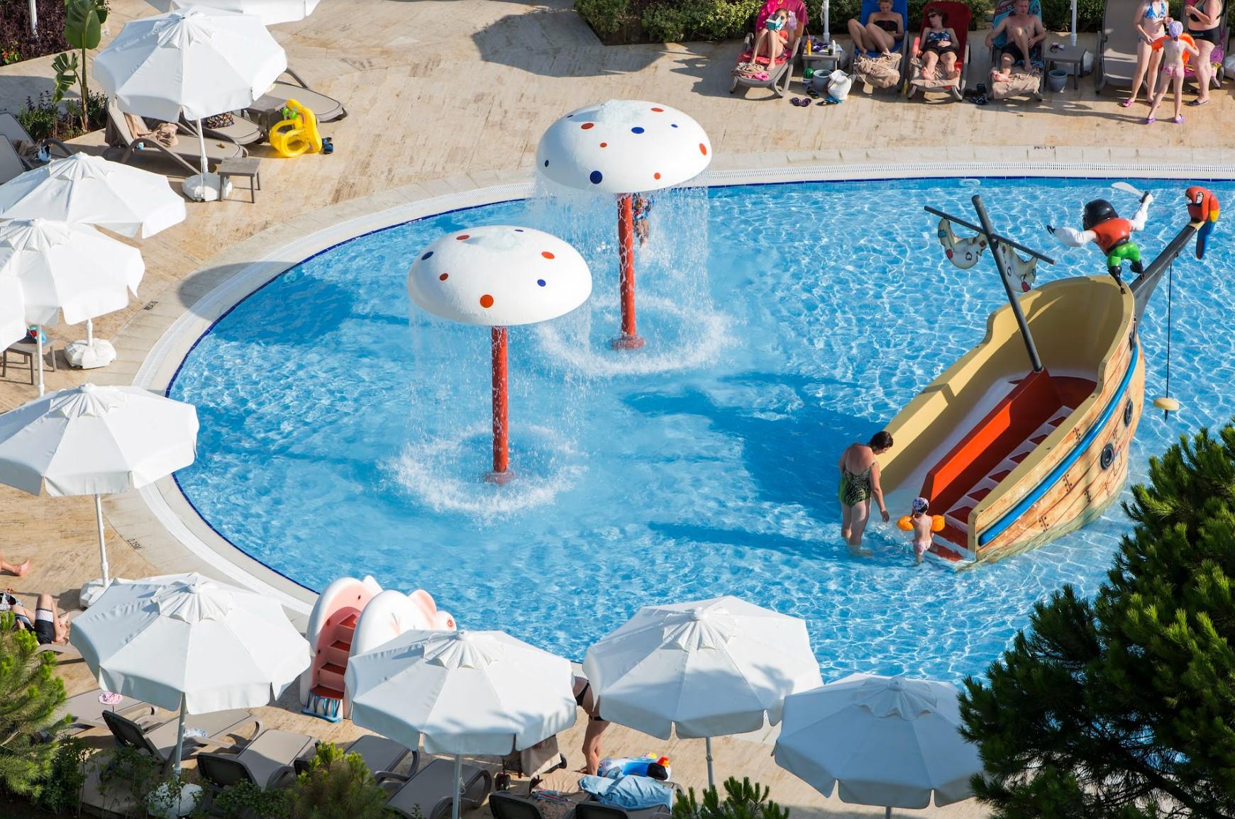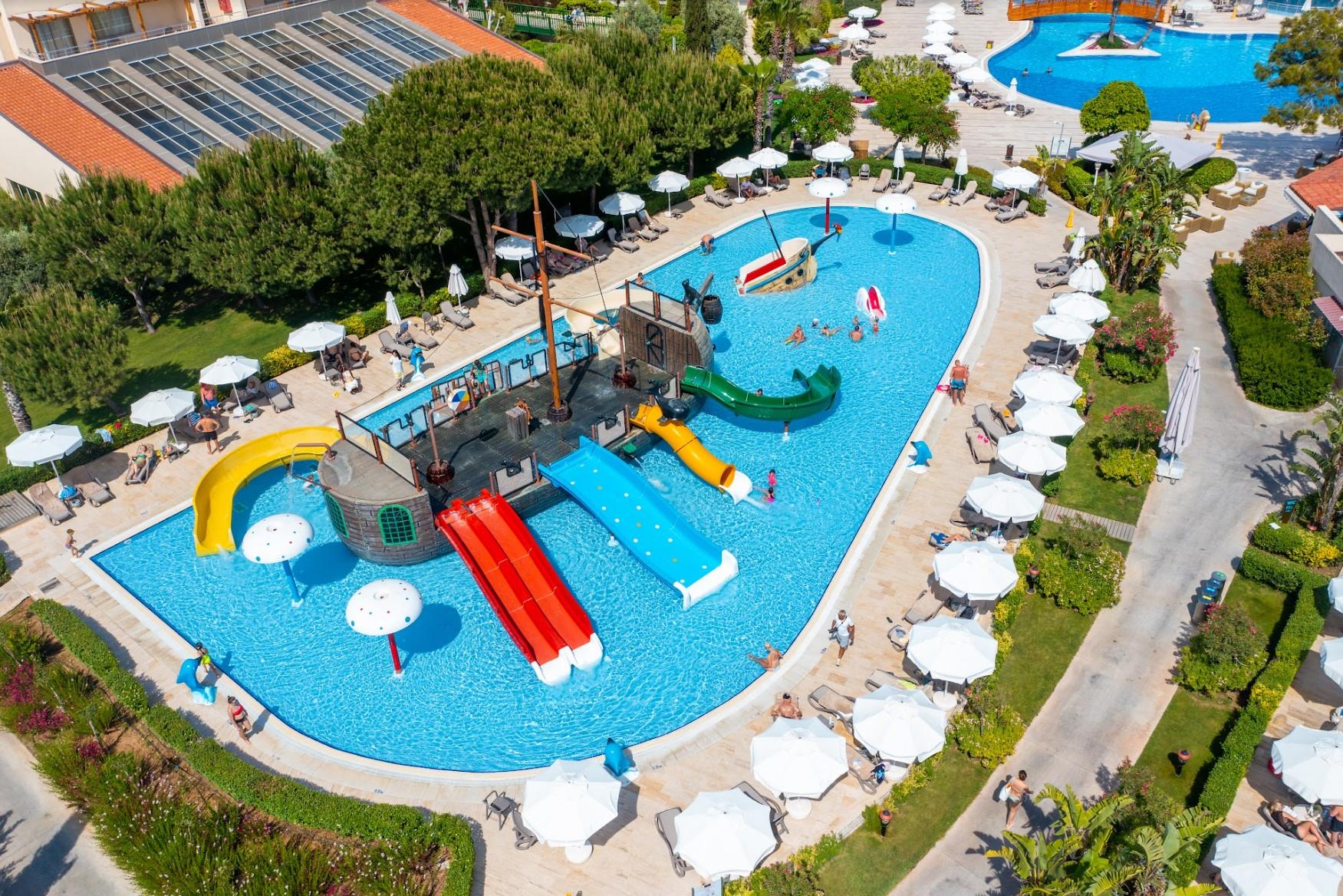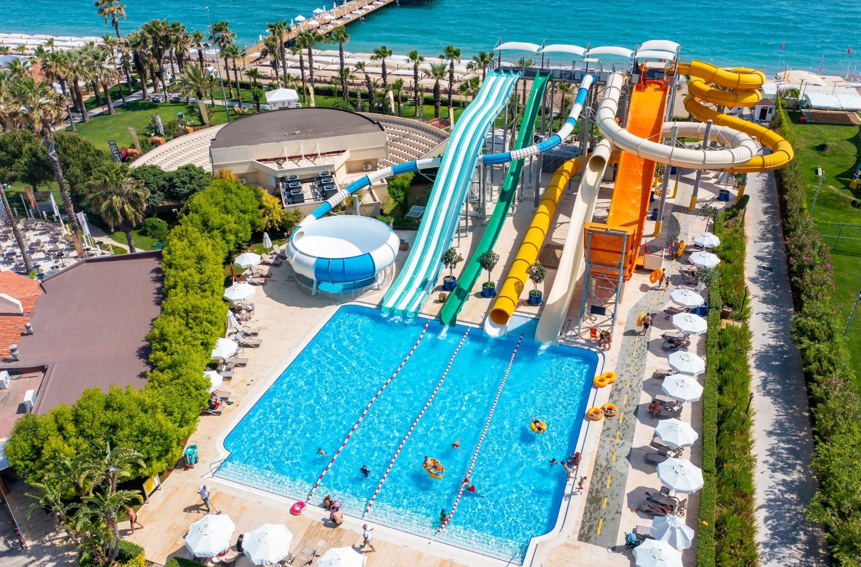 Закрытый Бассейн (1,4 м; 148 м²) СПА Центр; Закрытый Бассейн (детский ) (35 cм; 5 м ²) СПА Центр; Аквапарк с 9 горками (для детей)(40 cм; 800 м²)Общая территория /1000 м²; Аквапарк (Для взрослых) с 8горками : Горка-волна, Горка-летучка,Свободное Падение, Черная дыра, Множественная Горка ,Горка-рафтинг (1,2 м;260 м²) Общая территория/ 1600 м²; Бассейн Space Holl (1,8 м; 25 м²) Общая территория; Главный Бассейн (1,4 м; 920 м²) Общая территория, Детский Бассейн (35 cм; 80 м²) Общая территория; Релакс Бассейн (1,4 м, 850 м²) - Общая территория; Детский Бассейн Jasmine (40 cм; 28 м² Озерные домики Jasmine); Бассейн озерных домиков Jasmine (1,4м; 1600 м²; озерные домики Jasmine), Бассейн Вилл (1,4 м, 591 м²) - зона Вилл.