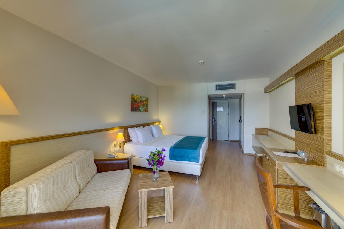 Супериор номер: 45-50 м². Спальная комната с одной двуспальной или двумя односпальными кроватями, ванная комната (ванна / туалет). Минимальное размещение 2, максимальное 4 человека). С балконом. Напольное ковровое покрытие.