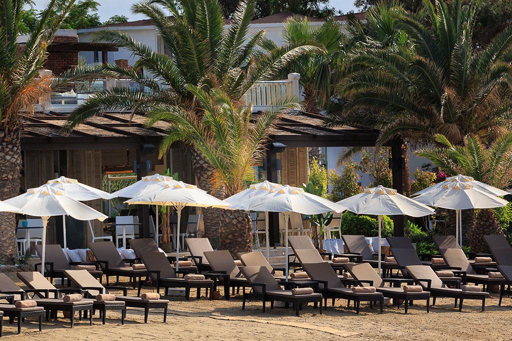 Частный песчаный пляж, заход в море – песок, есть понтон; шезлонги, зонтики и пляжные полотенца предоставляются бесплатно.