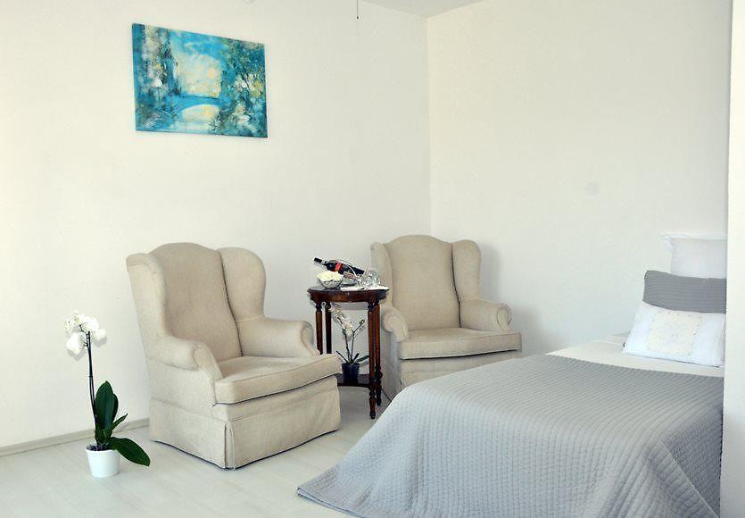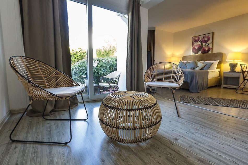 Suite номер-люкс площадью 40 кв. м. с спальной комнатой и гостиной с видом на бассейн. В номере две односпальные или двуспальные кровати. Максимальное размещение 4 чел.