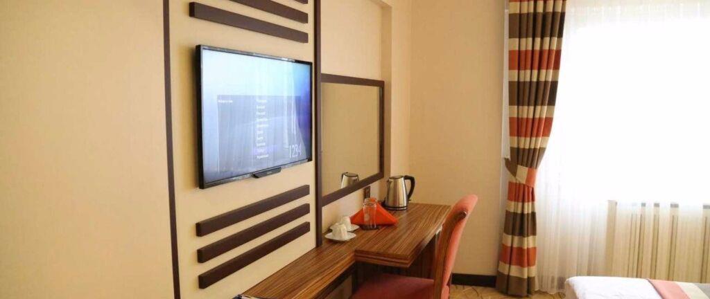 В номере вы найдёте душ, телевизор, мини-бар, халат и тапочки. Оснащение зависит от выбранной категории номера.