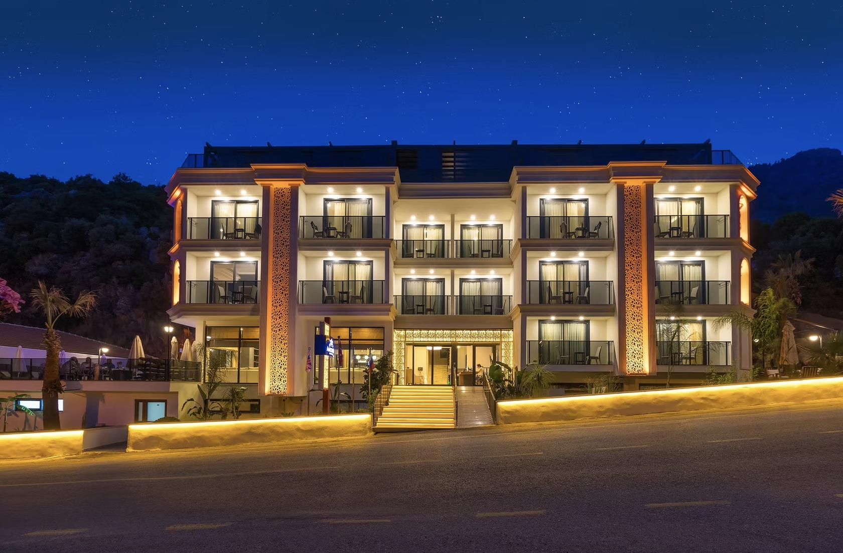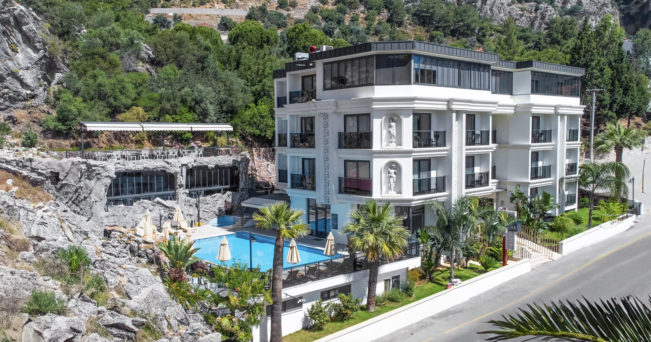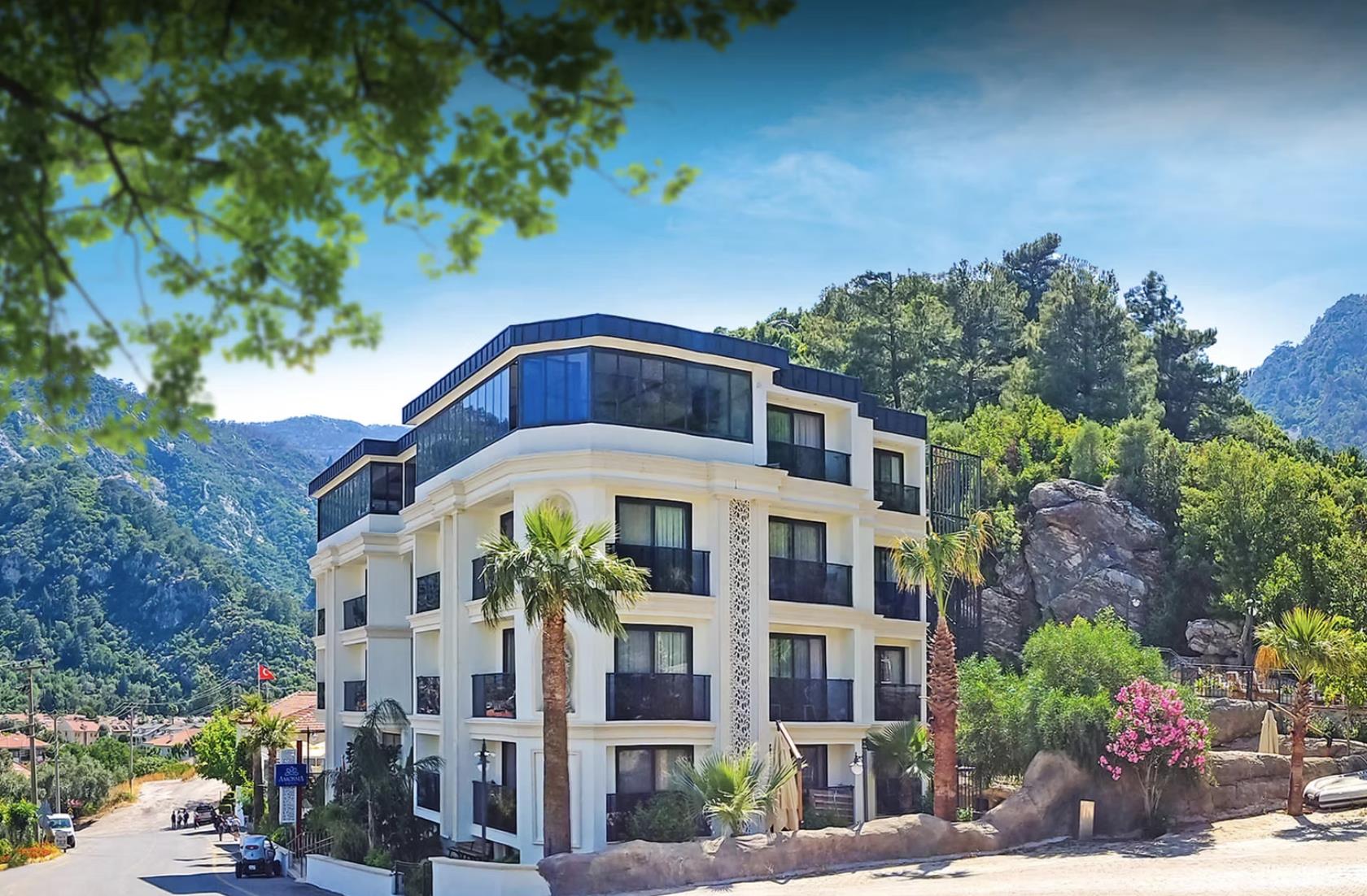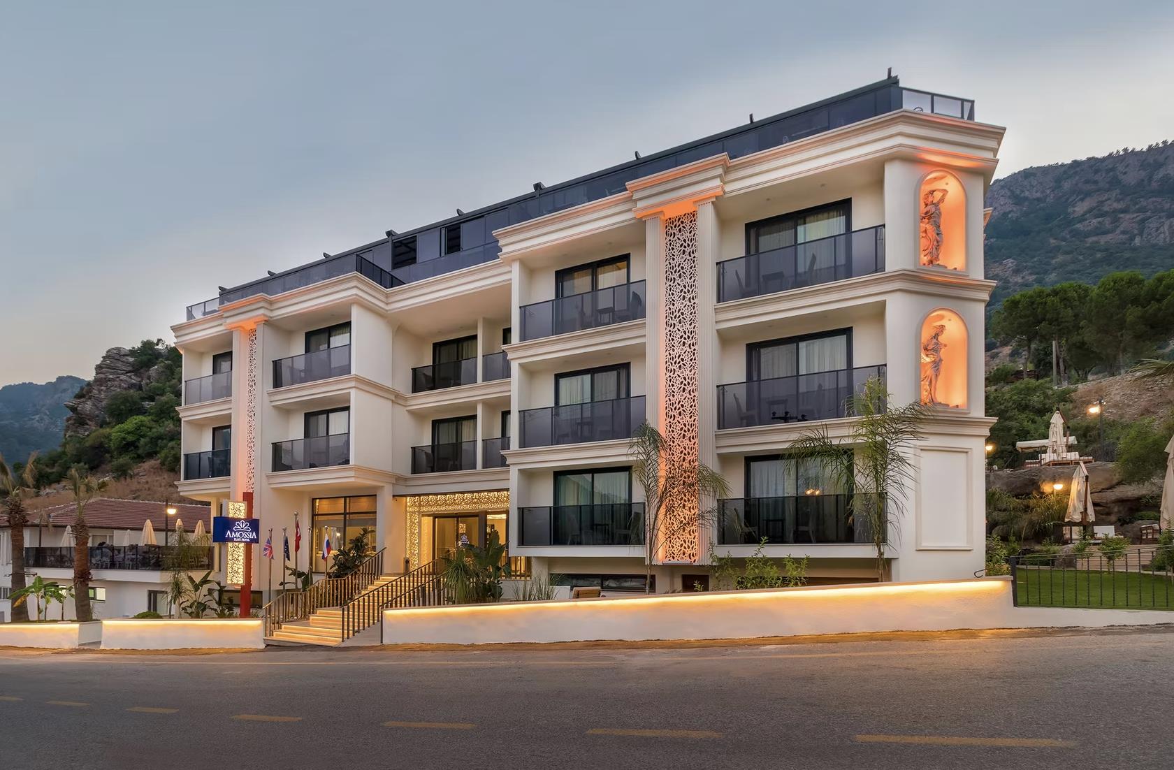 Отель Amossia Elite Hotel расположен в 116 км от аэропорта Даламан, в поселке Турунч.
