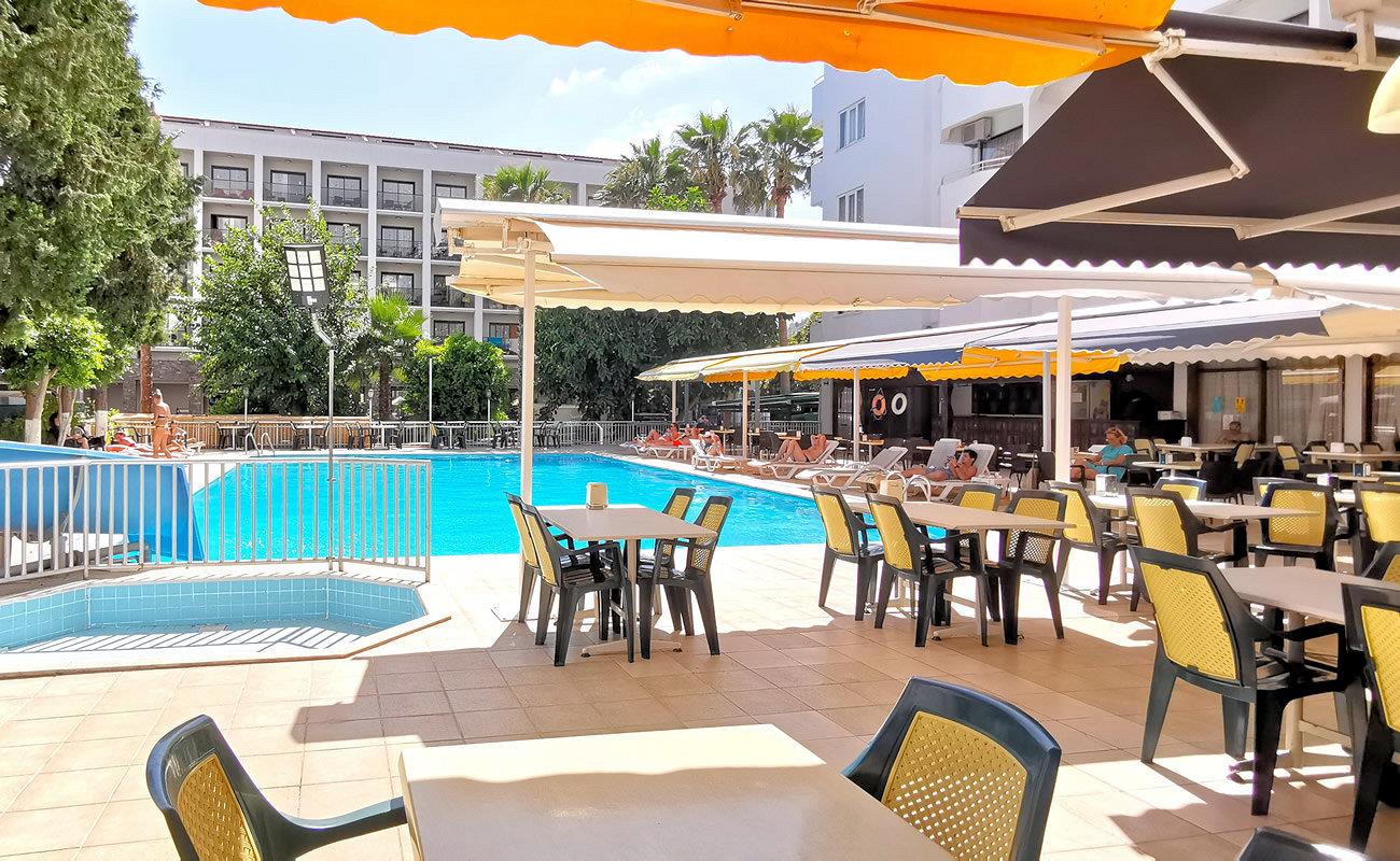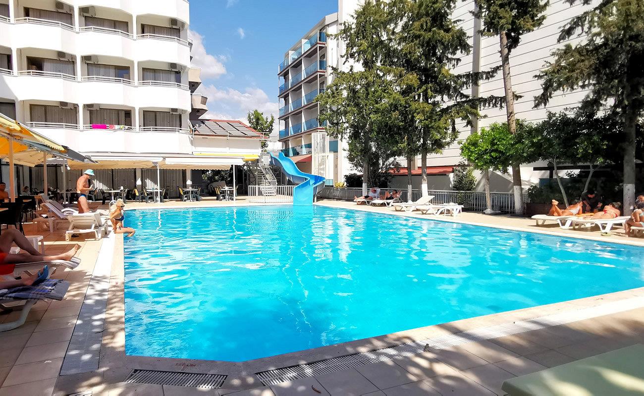Гордость отеля Intermar –открытый бассейн, один из самых больших в Мармарисе. Из него открывается живописный вид на ближайшие зеленые улицы и бульвар, ведущий к морю. Для любителей адреналиновых развлечений построена водная горка, а для желающих погреться – просторная открытая терраса, оборудованная шезлонгами и зонтиками. Здесь же расположился бар, предлагающий прохладительные напитки и легкие закуски. До великолепного берега Эгейского моря от отеля всего несколько минут ходьбы. Уединенная бухта – хорошее место как для купания, так и для занятий водными видами спорта.