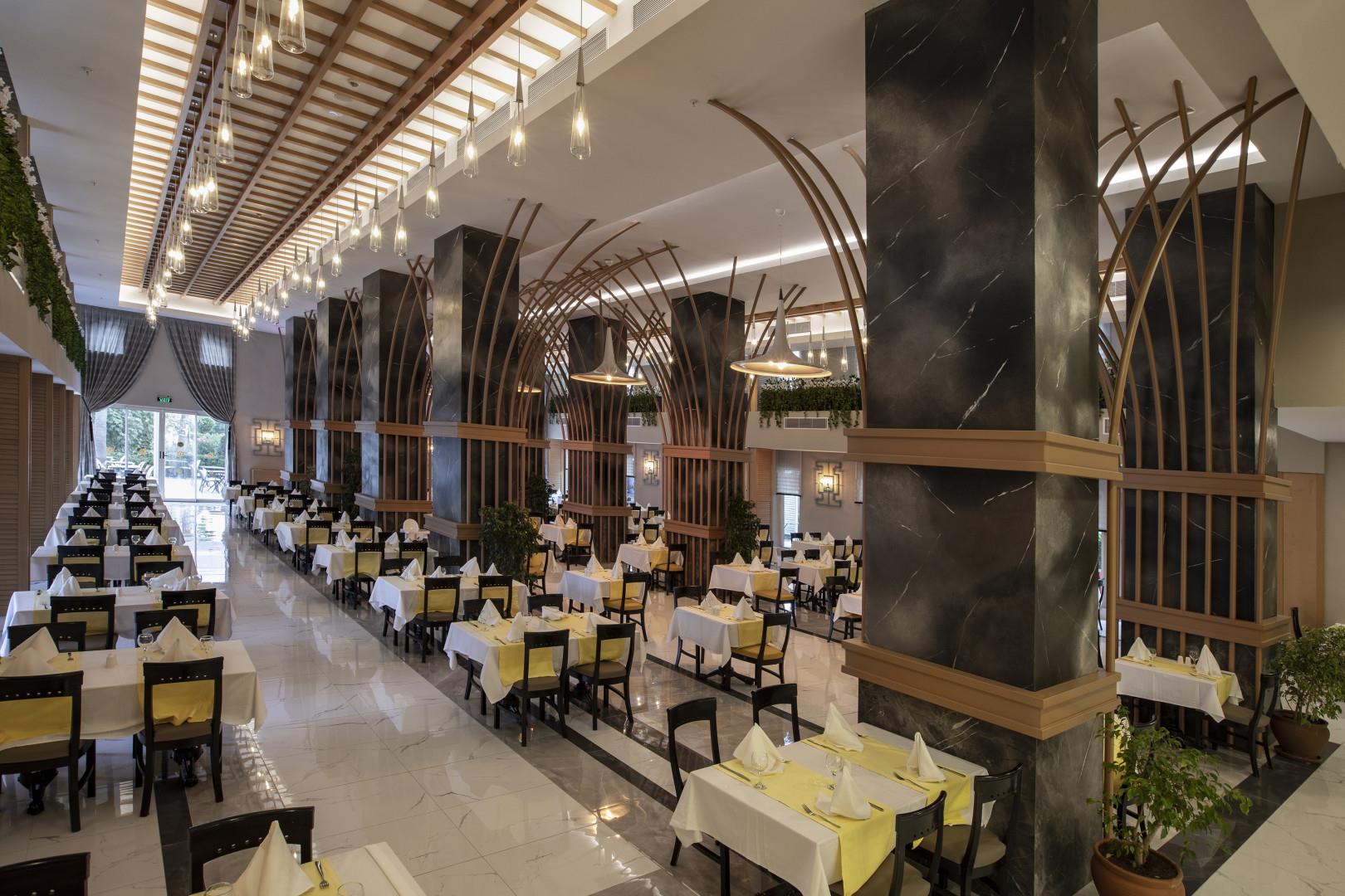 При отеле работают главный ресторан со шведским столом, рестораны, в которых по меню подают блюда турецкой, мексиканской и итальянской кухни, и закусочная.